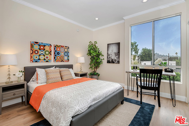Sensational remodeled luxury condo! Embrace urban living in this prime Eastside location tucked between Hollywood and Silver Lake! This larger top-floor corner unit is bright, open and modern. Enter to soaring ceilings and huge picture windows. Enjoy views of Downtown L.A. & the Hollywood Hills. Invite guests outdoors to your private balcony and take in the city lights. Truly move-in ready and updated to contemporary tastes with new floors, new fireplace, recessed lighting, crown molding, and fresh paint. The kitchen features gorgeous cabinetry, a double farmhouse sink, stone countertops, and stainless steel appliances. Sunny bedrooms include custom closet systems and private bathrooms with refinished tubs. Bonus storage area and two-car gated parking. Convenient to 101, unique coffee shops, cafes and eateries, street art, bars, shopping and fitness studios. Nearby is Silver Lake reservoir with a popular walking trail and dog park.