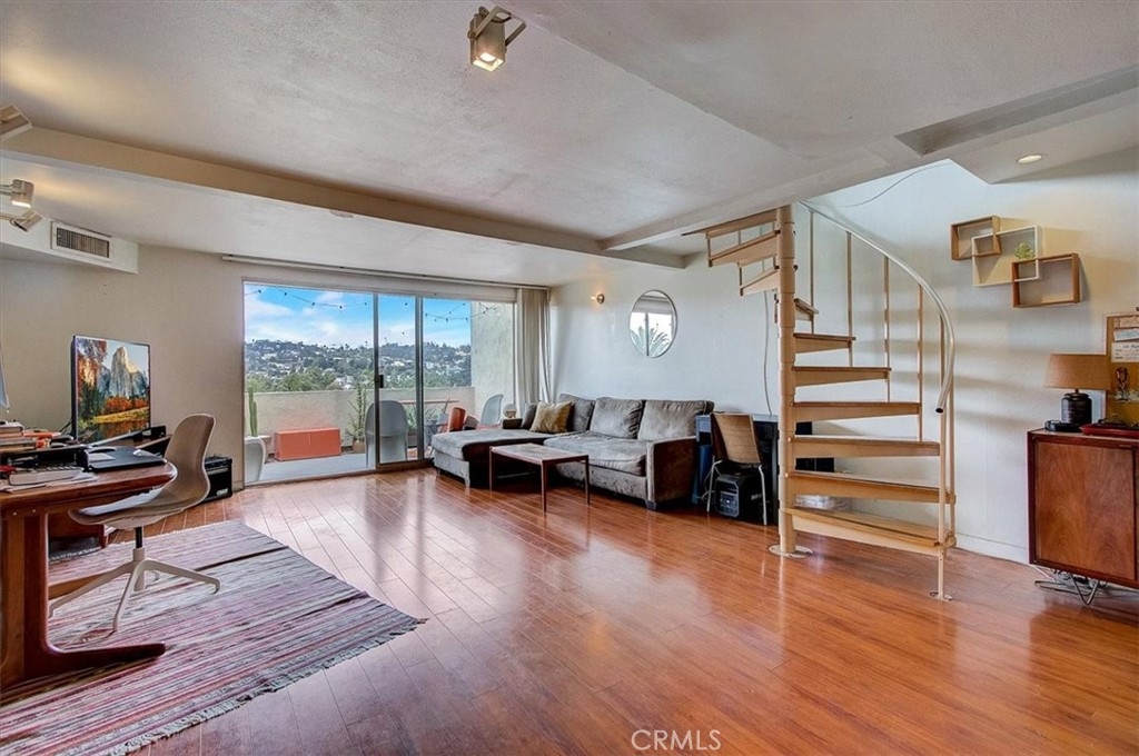 Welcome home to this incredibly rare townhouse style condo unit at the modernist Lago Vista complex in Echo Park designed by architect Allyn E. Morris, 1973. With sweeping views and a stylish design, this second floor unit is a comfortable and modern place to live in the heart of the east side. Open concept living area with beamed ceiling, laminate floors and great flow out to a large balcony that overlooks Echo Park Lake and Hills. Two bedrooms and one bathroom, ample closet space and quality finishes. The Lago Vista complex is an oasis in the city with beautifully landscaped grounds, a private pool, and timeless mid-century modern design. Centrally located with a walk score of 83, Lago Vista is just steps from Echo Park lake and Sunset Blvd with all the best shops and restaurants just outside your door. Easy access to the 101, 110 and 5 freeways.
