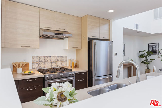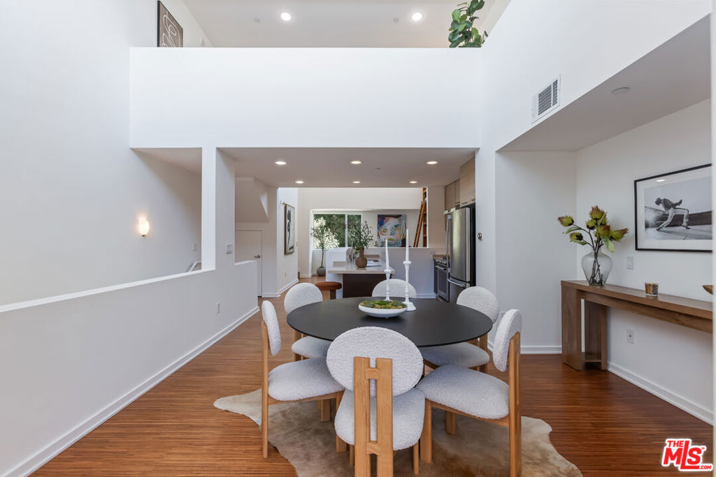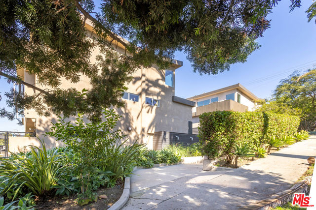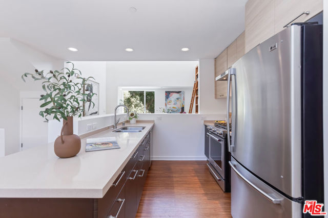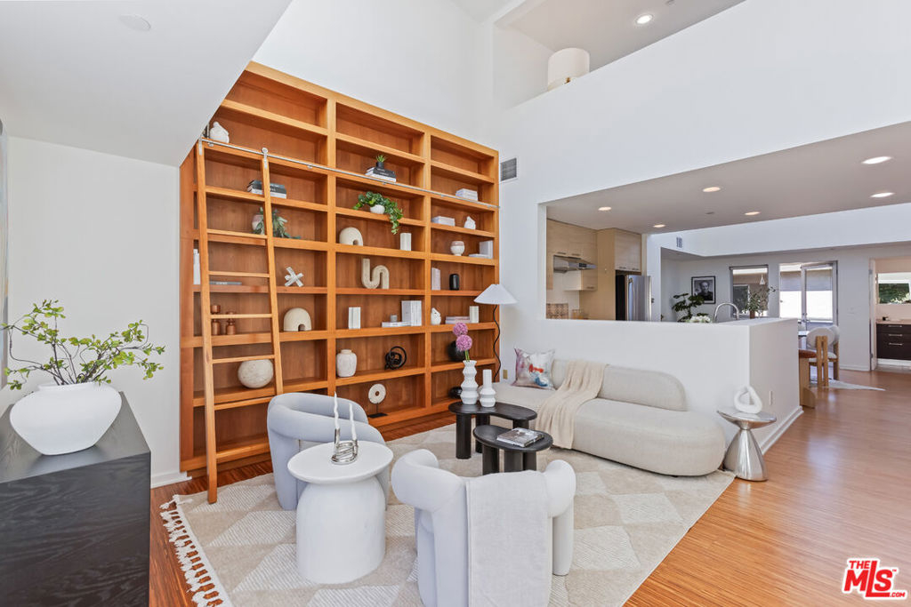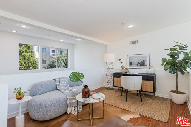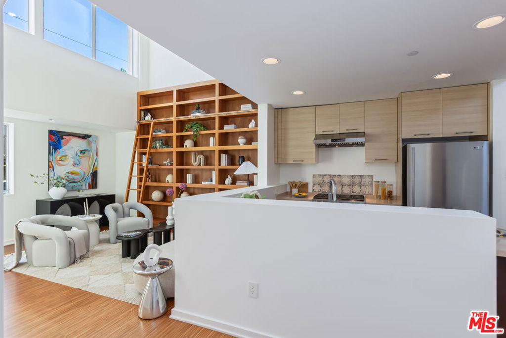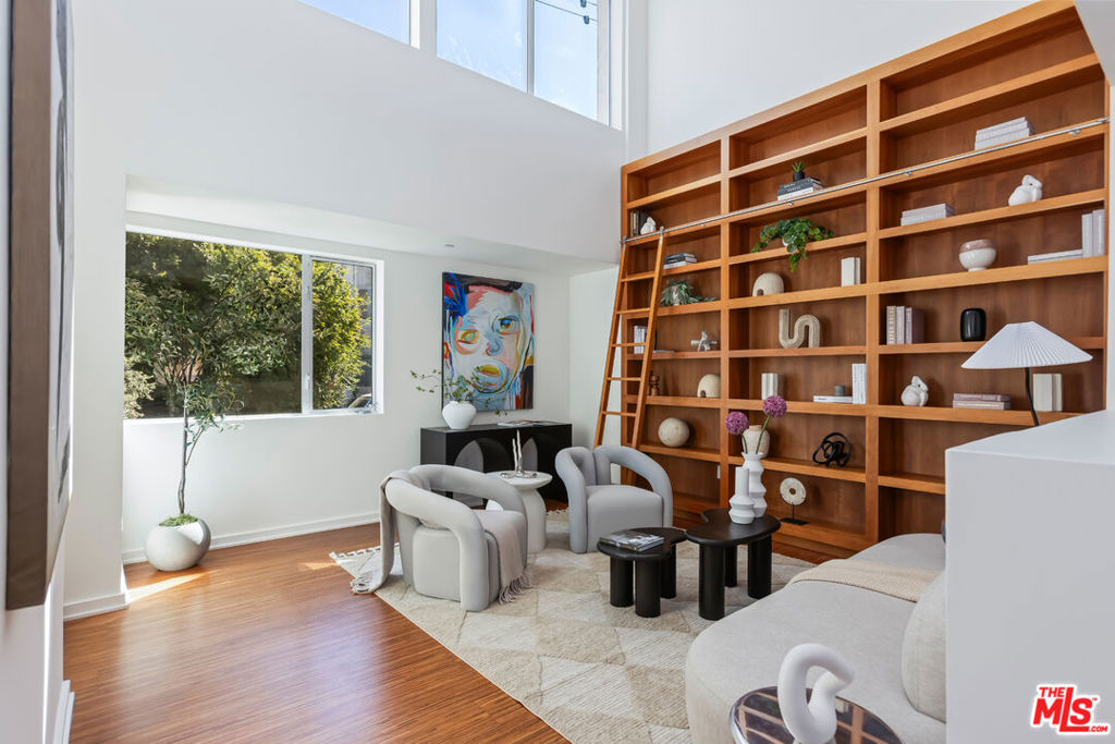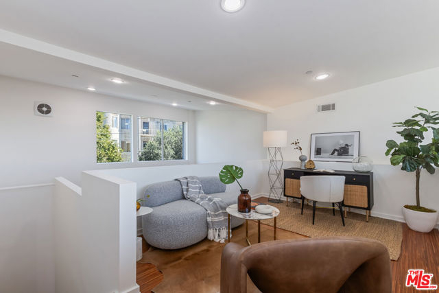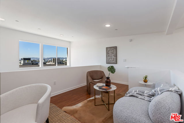 Stylish, design-forward Modern townhome in award-winning building by Chu + Gooding Architects. 2 beds/2.5 baths plus a lofted mezzanine with sweeping views. Clean lines, open volumes, and voluminous double-height ceilings create a striking interplay of space and light. The entry level provides a tranquil primary suite, a guest suite and convenient in-unit laundry. Upstairs, an airy living and dining area opens to a balcony enveloped in greenery, while a sleek kitchen, custom bookcase and powder room complete the level. Above it all, the lofted mezzanine floats in light, an inspiring space for work, art or relaxation with sunset views over the Hollywood Hills that stretch toward Century City and beyond. Located in one of Silver Lake's most vibrant neighborhoods, a short stroll to local favorites Courage Bagels, Sqirl, Doto, Budonoki, Bellevue Park, and all of Sunset Junction. With gated side-by-side parking, guest spaces, and private storage, this home captures the essence of East side living - Modern, creative and effortlessly cool.