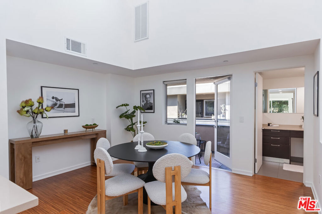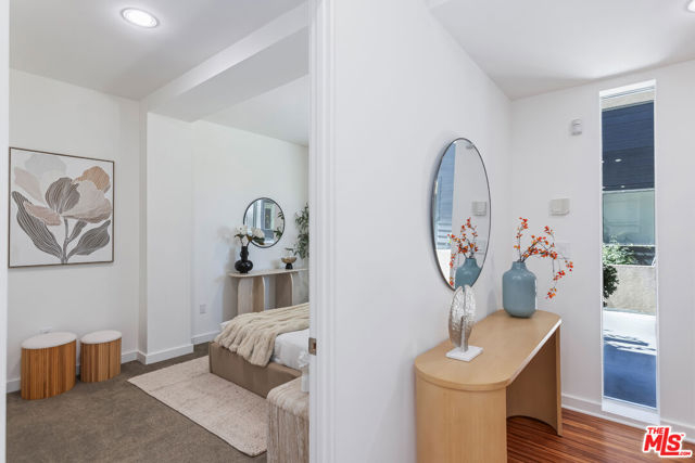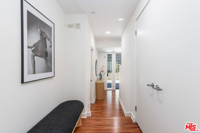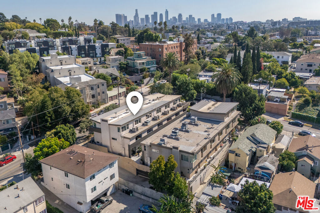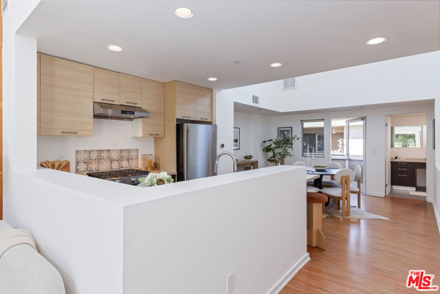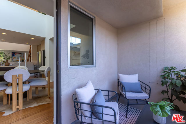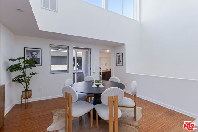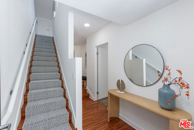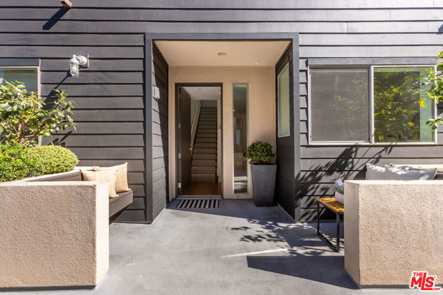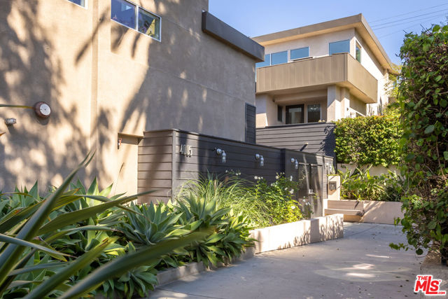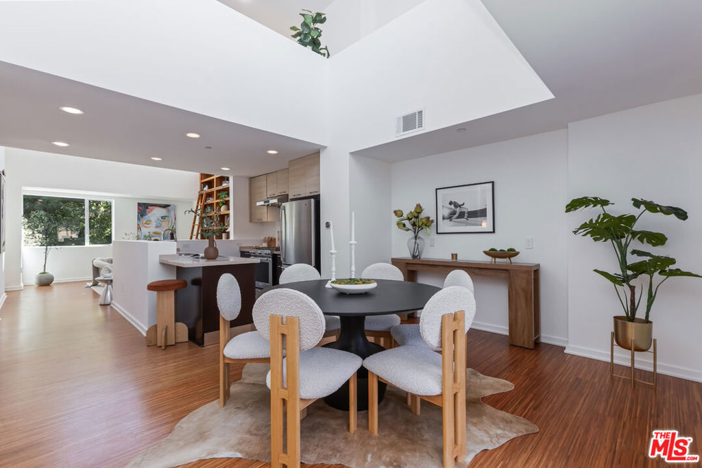 Stylish, design-forward Modern townhome in award-winning building by Chu + Gooding Architects. 2 beds/2.5 baths plus a lofted mezzanine with sweeping views. Clean lines, open volumes, and voluminous double-height ceilings create a striking interplay of space and light. The entry level provides a tranquil primary suite, a guest suite and convenient in-unit laundry. Upstairs, an airy living and dining area opens to a balcony enveloped in greenery, while a sleek kitchen, custom bookcase and powder room complete the level. Above it all, the lofted mezzanine floats in light, an inspiring space for work, art or relaxation with sunset views over the Hollywood Hills that stretch toward Century City and beyond. Located in one of Silver Lake's most vibrant neighborhoods, a short stroll to local favorites Courage Bagels, Sqirl, Doto, Budonoki, Bellevue Park, and all of Sunset Junction. With gated side-by-side parking, guest spaces, and private storage, this home captures the essence of East side living - Modern, creative and effortlessly cool.