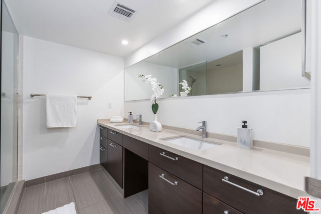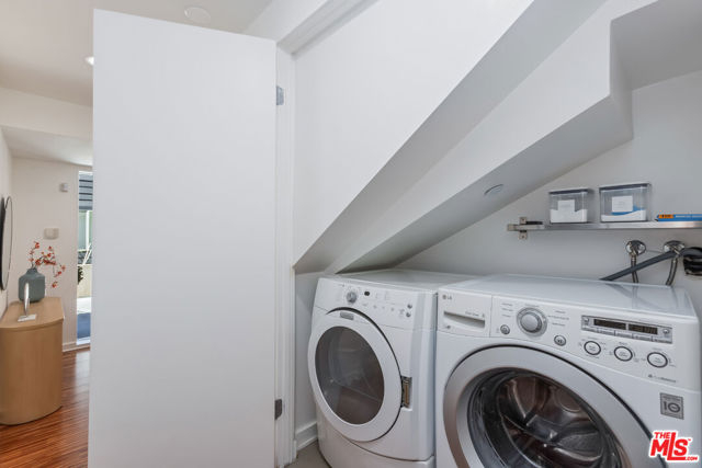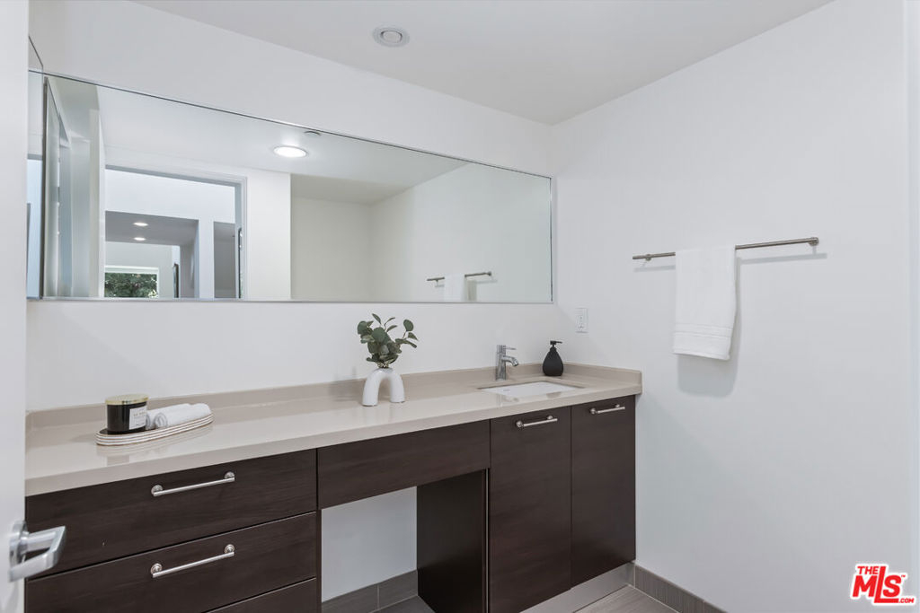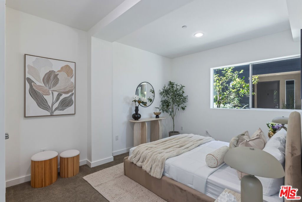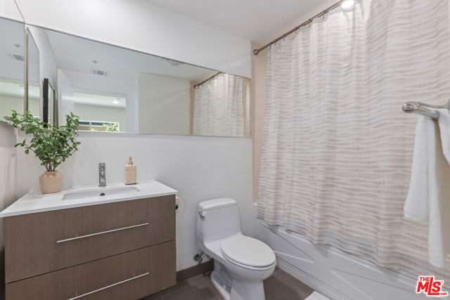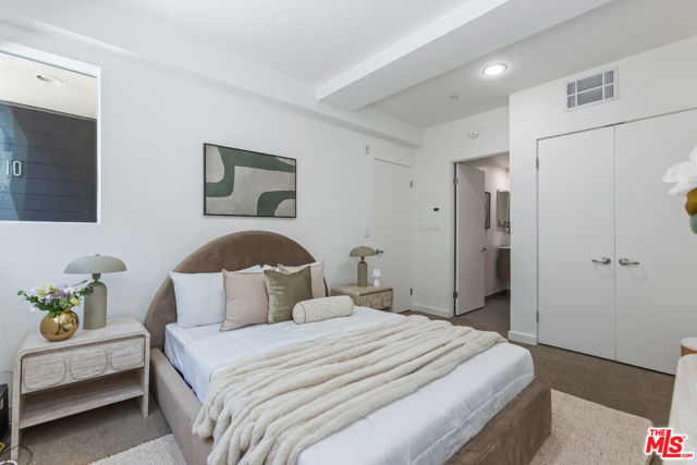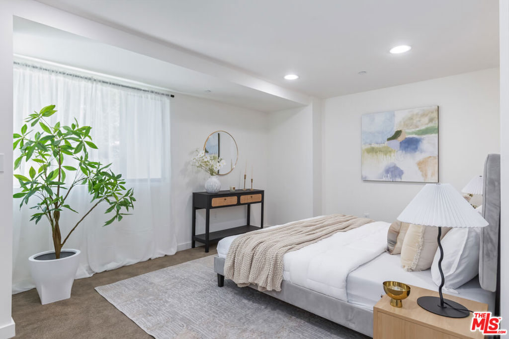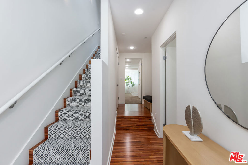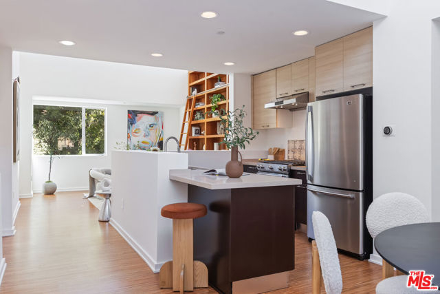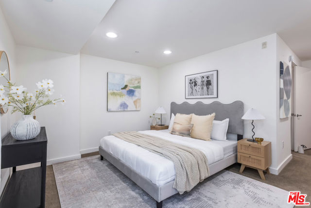 Stylish, design-forward Modern townhome in award-winning building by Chu + Gooding Architects. 2 beds/2.5 baths plus a lofted mezzanine with sweeping views. Clean lines, open volumes, and voluminous double-height ceilings create a striking interplay of space and light. The entry level provides a tranquil primary suite, a guest suite and convenient in-unit laundry. Upstairs, an airy living and dining area opens to a balcony enveloped in greenery, while a sleek kitchen, custom bookcase and powder room complete the level. Above it all, the lofted mezzanine floats in light, an inspiring space for work, art or relaxation with sunset views over the Hollywood Hills that stretch toward Century City and beyond. Located in one of Silver Lake's most vibrant neighborhoods, a short stroll to local favorites Courage Bagels, Sqirl, Doto, Budonoki, Bellevue Park, and all of Sunset Junction. With gated side-by-side parking, guest spaces, and private storage, this home captures the essence of East side living - Modern, creative and effortlessly cool.