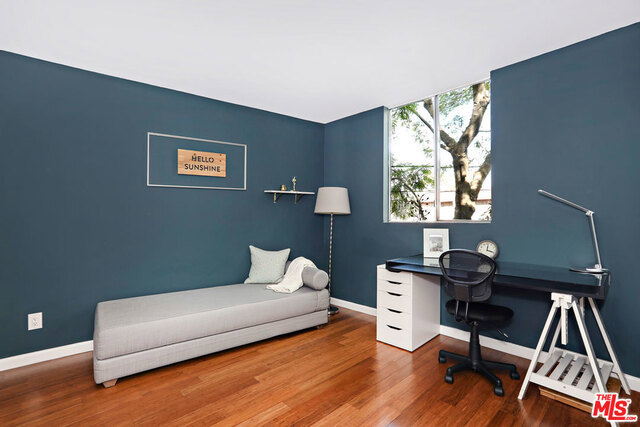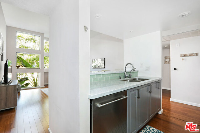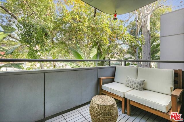 This bright, stylish and well-priced condominium home places you in a gated community in prime Silver Lake, very near Sunset Junction. The updated unit features a spacious living room with high ceilings and easy flow to a balcony, your sweet spot for morning coffee. Oversized windows bring in ample sunlight filtered through lush flora outside. In the sunlit kitchen find marble countertops, a full-height tile backsplash and a gleaming suite of stainless appliances. Wood flooring runs throughout. Two bedrooms include the Master with a walk-in closet and balcony access; the second bedroom is perfect for your office or guest space. Conveniences include central heat+air, community laundry and assigned parking. The tranquil grounds feature wide hallways, skylights and an abundance of potted plants. Sunset Junction is right up the street with trendy shopping and dining options including Mh Zh, Intelligentsia, Pine & Crane, Cafe Stella, Black Cat, The Silver Lake Farmers Market and more.