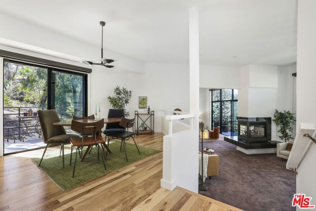This architectural split-level condo in the heart of the Silverlake hills offers stunning reservoir and hillside views and unparalleled privacy. The small Silverview Community was designed by Abronson & Kiyohara, AIA and evokes classic Modernism with clean lines. Perfect for entertaining, this private back-end corner unit features a sizable sunken living room, a three-sided fireplace, towering ceilings, and a wall of glass that opens to a large balcony with panoramic views. The primary suite boasts an expansive walk-in closet, ensuite bathroom and a private outdoor patio. Just a few feet away is a large pool and hot tub which creates a peaceful resort-like setting. In the gated garage there are two large personal storage rooms, two assigned parking spots (one with an electric charger) and dedicated guest parking. Tucked in the back of the complex, this sundrenched unit feels like a quiet vacation away from it all, but remains just minutes from the dog park, Silver Lake meadows, and restaurants on Silver Lake Blvd.