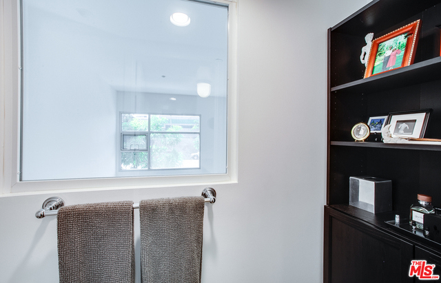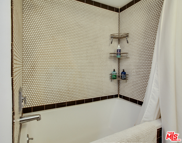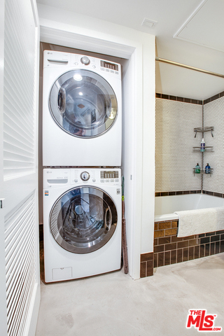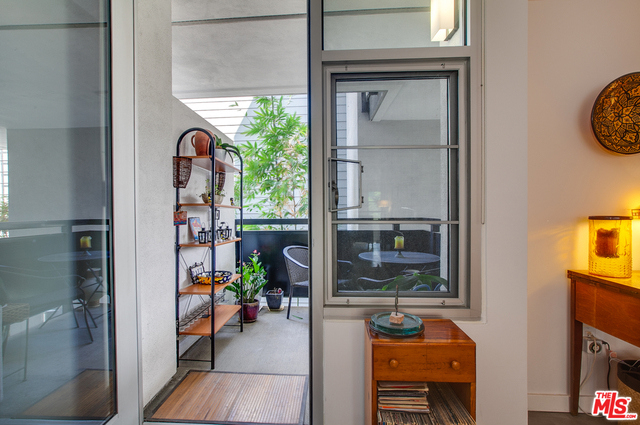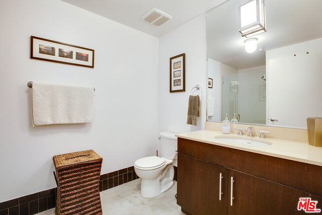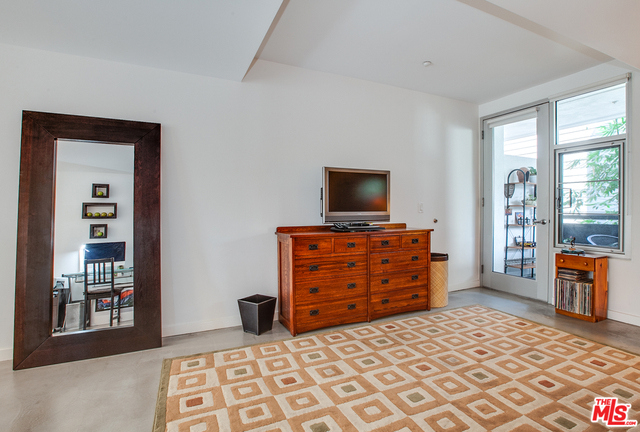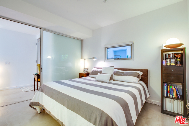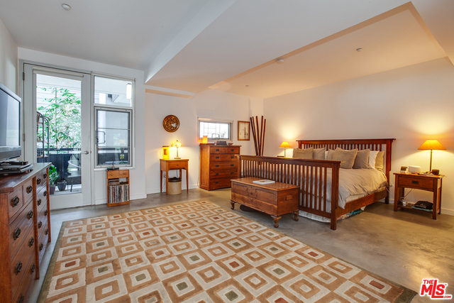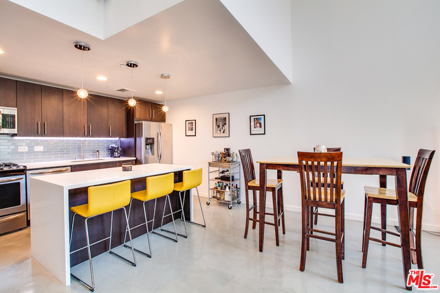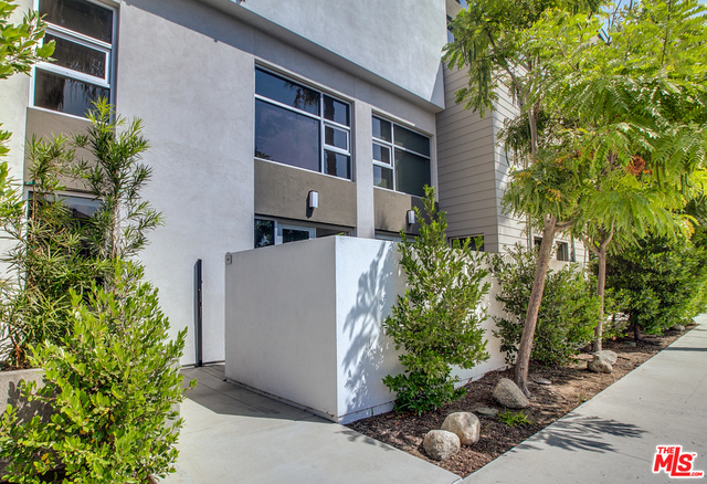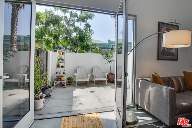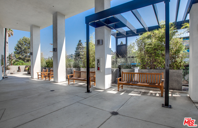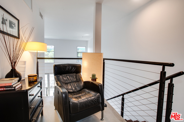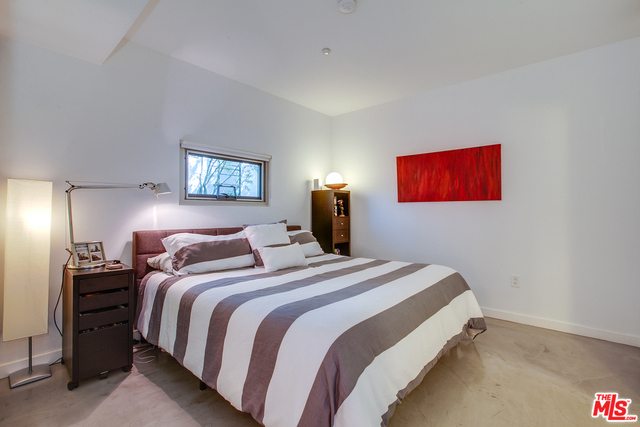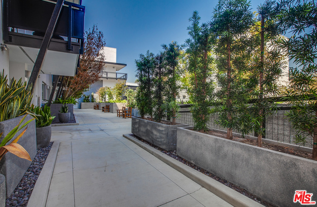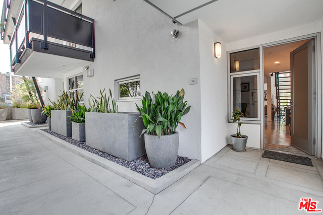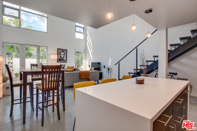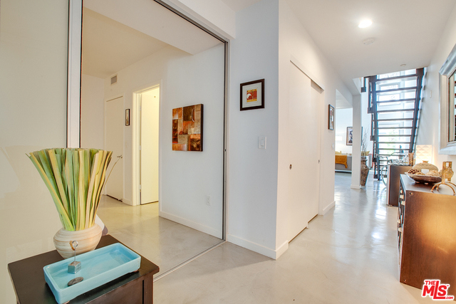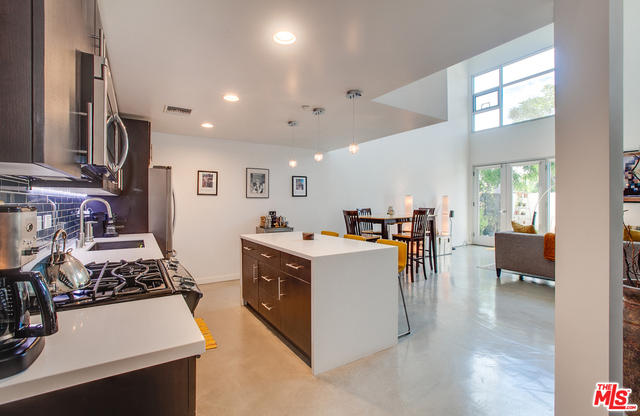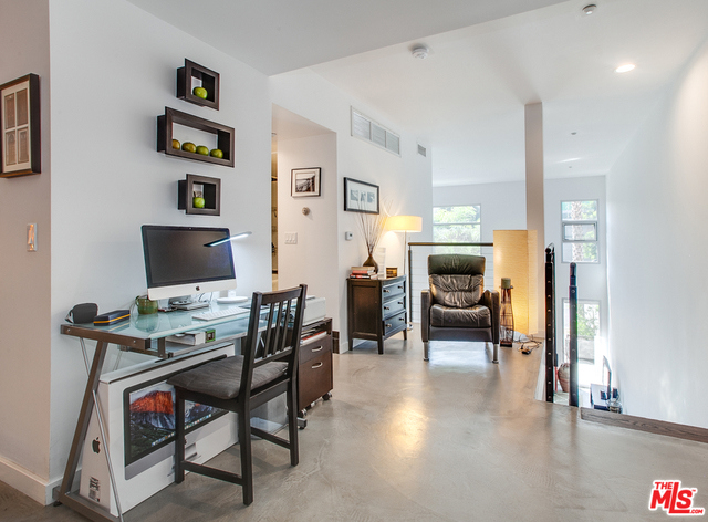 Contemporary two-story condominium in the heart of Sunset Junction. The modern industrial design of this property includes polished concrete flooring throughout, stainless steel appliances, double-pane windows, floating staircase to the second level, upstairs master suite, downstairs guest bedroom with en-suite bath, and two private outdoor spaces. Parking includes two side-by-side spaces in the subterranean garage. Common areas are landscaped in a park-like setting with mature foliage and bench seating along the walkways.