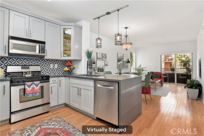 Welcome to elevated urban living in this beautifully updated corner unit at The Savoy, perfectly positioned at the crossroads of Little Tokyo and the Arts District—one of Downtown LA’s most vibrant and walkable neighborhoods. Located directly across from the new Regional Connector Metro Station, this home offers unmatched convenience with world-class dining, nightlife, and culture near by. Inside, the residence features an open-concept layout filled with natural light from oversized windows, complemented by a spacious private balcony overlooking the pool—ideal for morning coffee or evening unwinding. The remodeled kitchen is designed for both style and function, showcasing quartz countertops, a modern tile backsplash, updated stainless-steel appliances, soft-close cabinetry, and a breakfast bar perfect for casual dining or entertaining. A dedicated mini-bar with a built-in wine cooler adds an effortless hosting touch. The generously sized bedroom offers flexibility for a home office or reading nook, while the updated bathroom includes a bidet, shower/tub combo, and a brand-new, never-used in-unit side-by-side washer and dryer. Freshly painted and move-in ready, this home also includes assigned parking and a rare oversized private storage unit—a true luxury in the building. Residents of The Savoy enjoy an impressive collection of resort-style amenities, including 24-hour security and concierge, pool and spa, rooftop deck with skyline views, fitness center, yoga room, screening room, business center, clubhouse, BBQ areas, and gated guest parking.