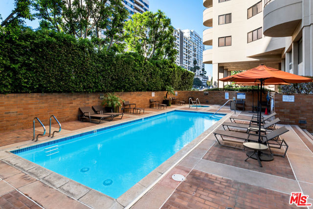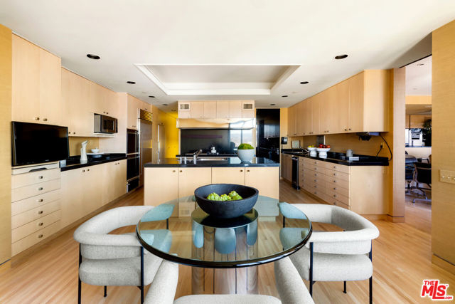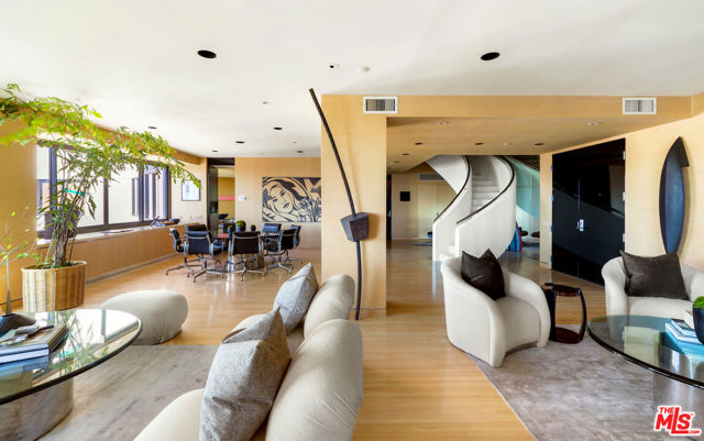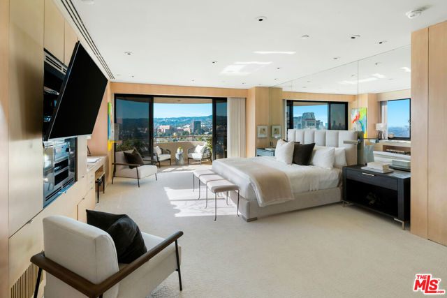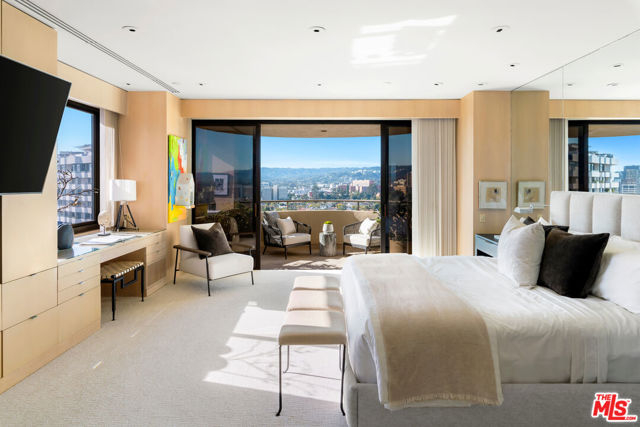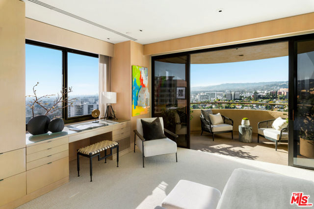 Absolutely sensational Sally Sirkin designed North/West corner suite occupying the 18th and 19th floors of the prestigious TEN-FIVE-SIXTY building on the Wilshire Corridor, where residents enjoy 24-hour valet and concierge services, gorgeous remodeled common areas including a spacious lobby, large social room with caterer's kitchen, fitness studio, pool and patios, and easy ingress and egress via Thayer Avenue. Enter suite 1803 to meet expansive views and exquisite design details throughout, including high gloss lacquer ebony interior doors, sea grass wall coverings, hardwood flooring and the finest carpentry displayed in vast built-ins throughout. The open floor plan reveals an architecturally inspiring floating stairwell, two seating areas, a dining area and outdoor terrace. The center island kitchen boasts granite counter-tops, wood cabinetry, stainless appliances, a spacious dining area and a butler's pantry with a laundry area. Also on the main floor is a sophisticatedly dressed powder-room for the service of guests. Upstairs find that highly coveted primary suite with outdoor terrace, custom office and media center, and dual bathrooms, each offering a large walk-in closet. The second en-suite bedroom is generous in size, and offers built-in cabinetry and a desk looking outward to the breathtaking view. There is elevator access to the second floor.