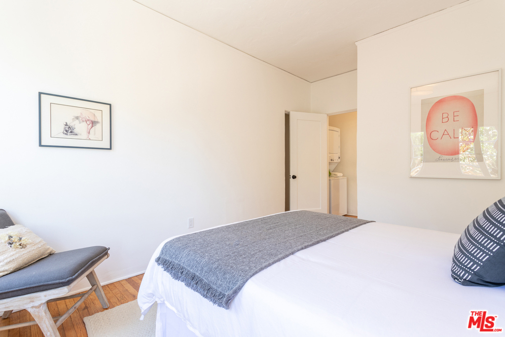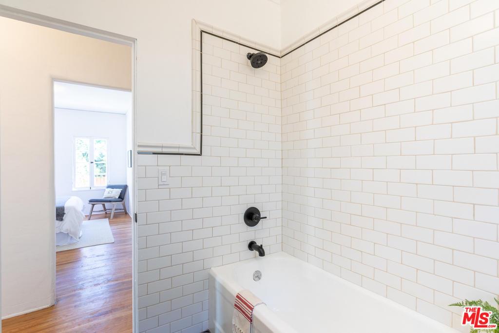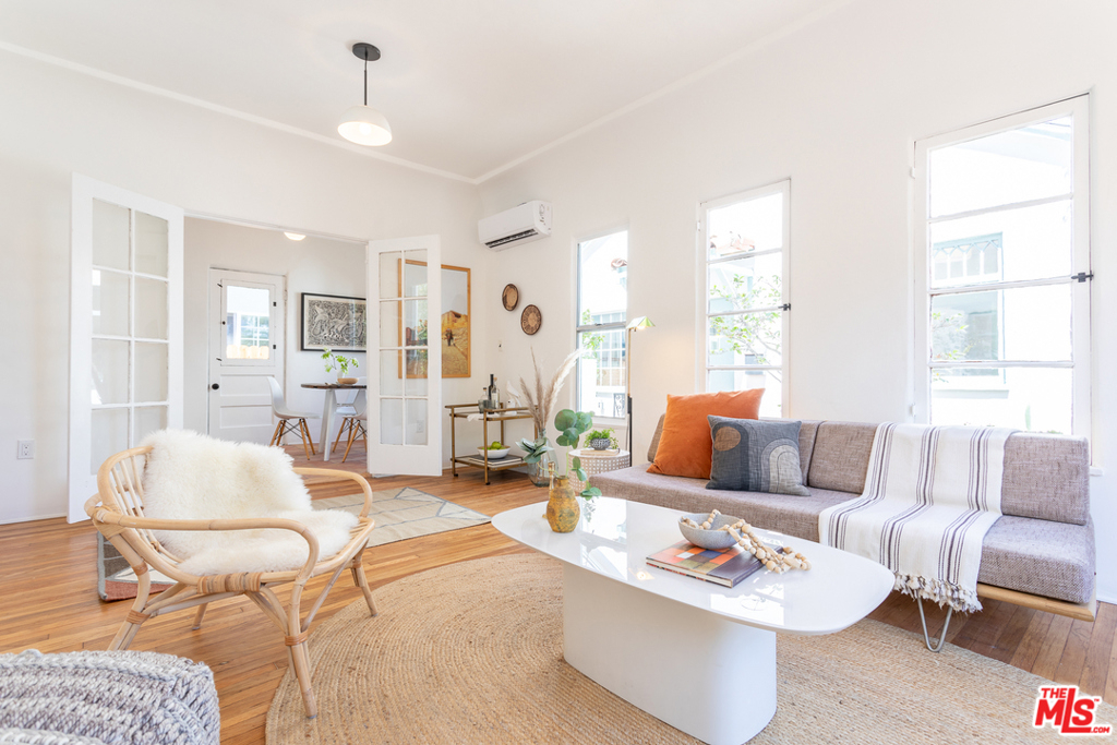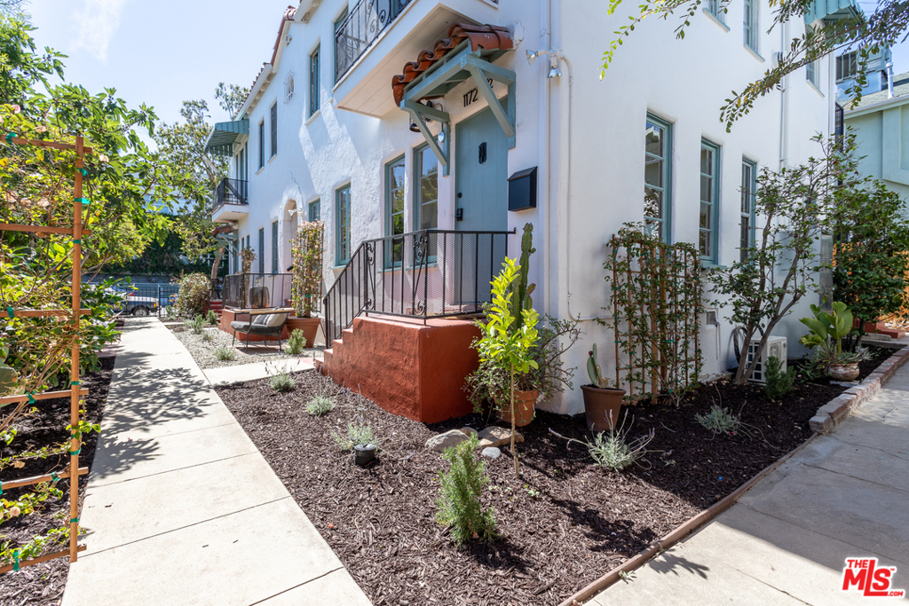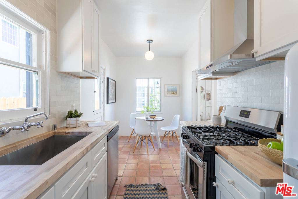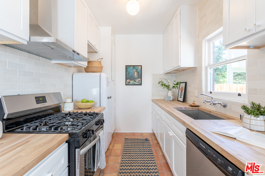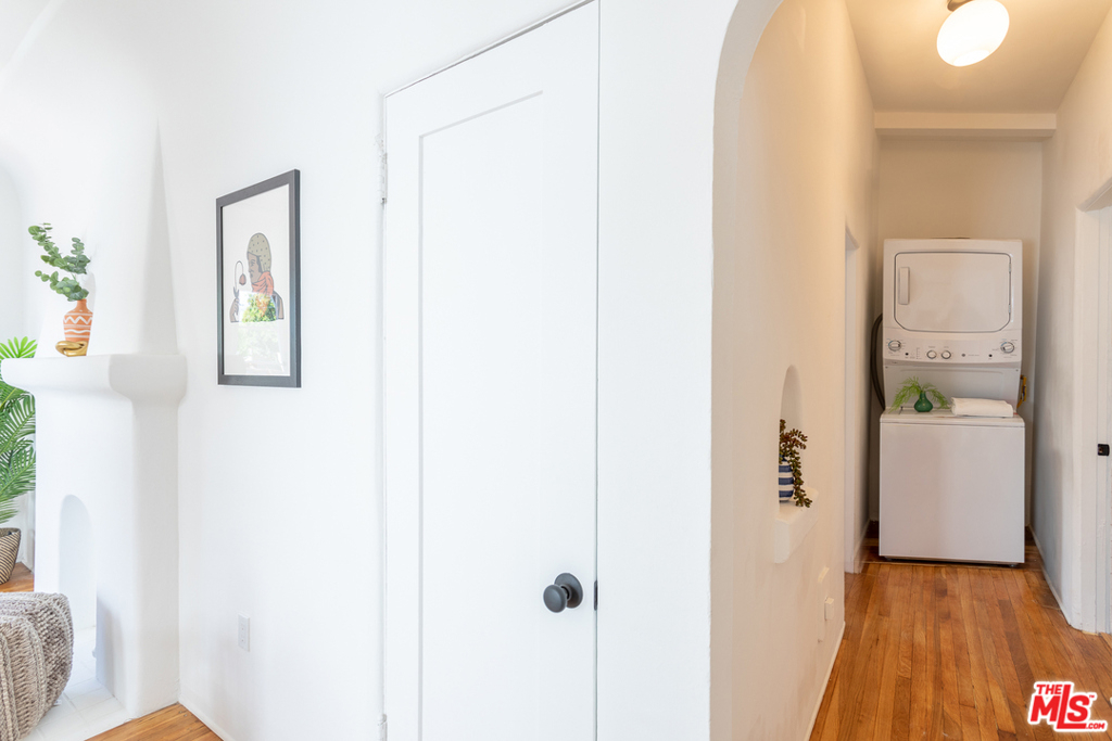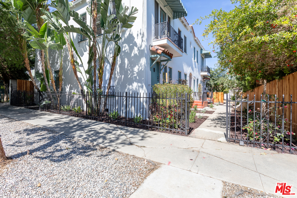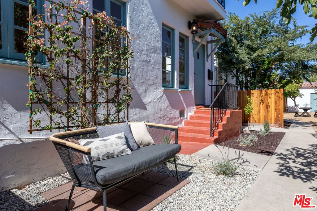 This 1930's romantic Spanish-style courtyard complex, just a few blocks to Silver Lake Sunset Junction, will make your heart swoon. The courtyard entrance is lushly landscaped w/ multiple patios and seating areas, lined w/ bougainvillea contrasting against the white stucco facade - simply stunning. Beyond the seafoam painted door is a light-filled home, unlike anything else in this price point, w/ high coved tray ceilings, French windows, original hardwood floors, and a smooth white period faux fireplace. Through a set of French doors is an all-new remodeled kitchen w/ dining nook, saltillo tile floors, designer backsplash tiles, new cabinets & shelves, new butcher block counters, an oversized sink, & new appliances, including a stainless steel stove, dishwasher, range hood & a new retro fridge. Enjoy breakfast w/ birds chirping through another French door that leads to your private back balcony. Through a curved doorway in the hall is the bedroom and a fully renovated bath with back hex tile flooring, subway tile walls over the cast iron tub, new matte black shower & faucet fixtures, and an oh-so-cool vintage-style black and white sink. This fantastic home checks the boxes, and then some: there's a stackable W/D in-unit, new ductless A/C and heat, one private single car garage, intimate 5-unit HOA with low HOAs.