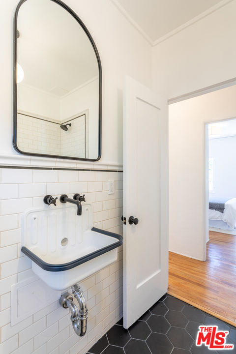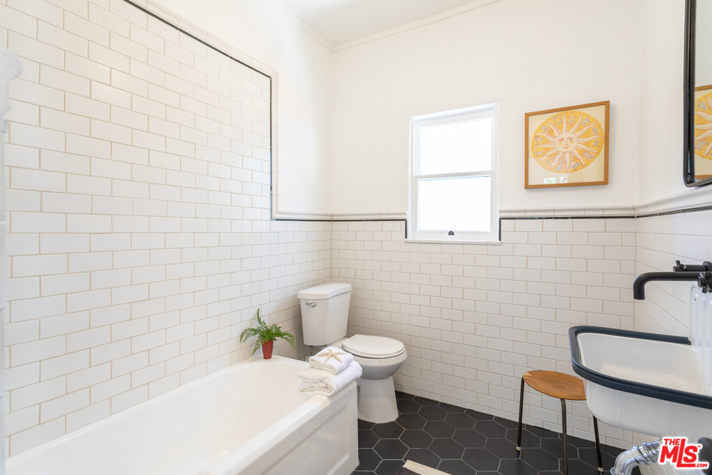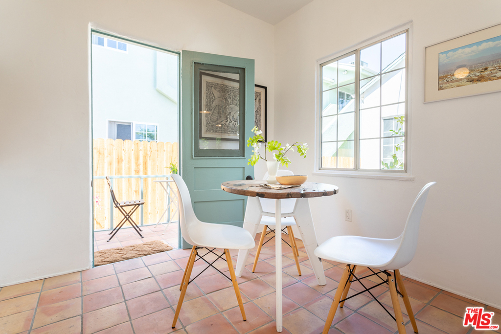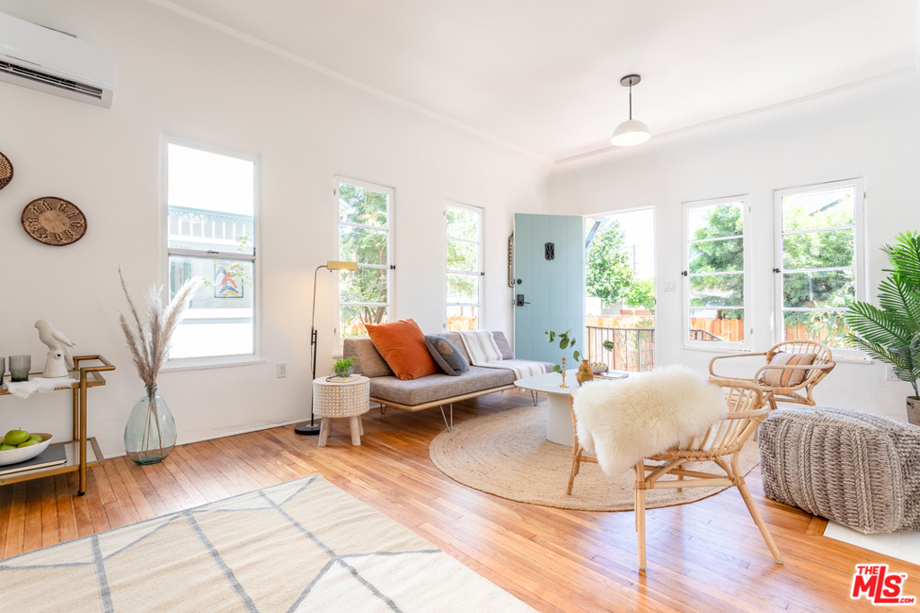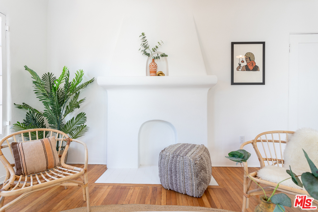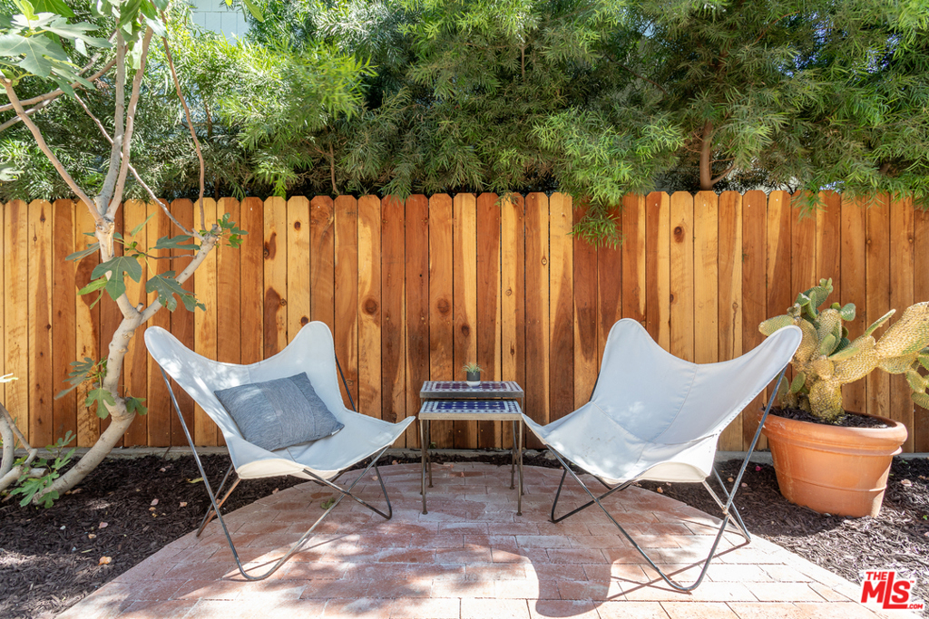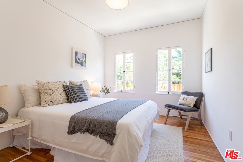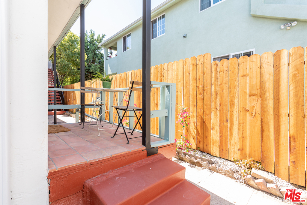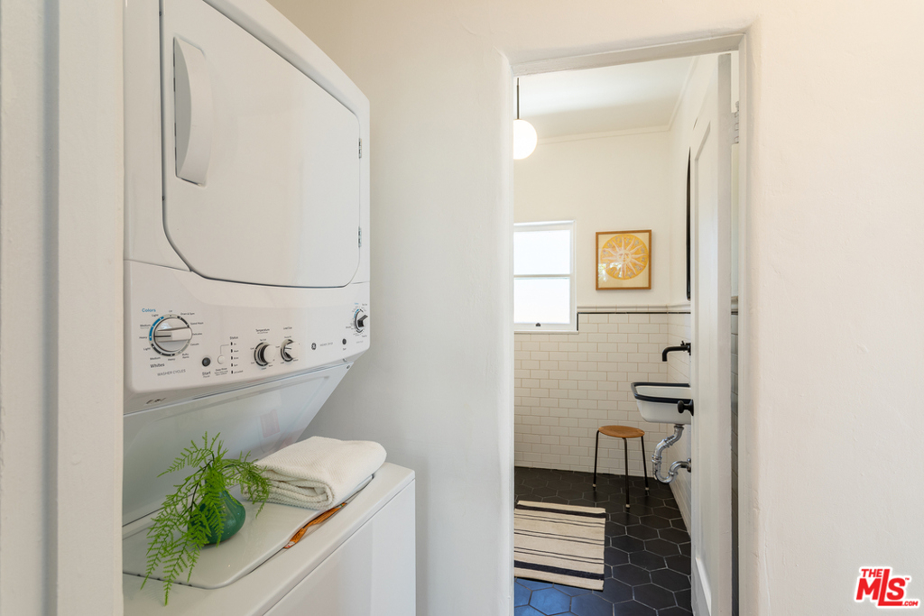 This 1930's romantic Spanish-style courtyard complex, just a few blocks to Silver Lake Sunset Junction, will make your heart swoon. The courtyard entrance is lushly landscaped w/ multiple patios and seating areas, lined w/ bougainvillea contrasting against the white stucco facade - simply stunning. Beyond the seafoam painted door is a light-filled home, unlike anything else in this price point, w/ high coved tray ceilings, French windows, original hardwood floors, and a smooth white period faux fireplace. Through a set of French doors is an all-new remodeled kitchen w/ dining nook, saltillo tile floors, designer backsplash tiles, new cabinets & shelves, new butcher block counters, an oversized sink, & new appliances, including a stainless steel stove, dishwasher, range hood & a new retro fridge. Enjoy breakfast w/ birds chirping through another French door that leads to your private back balcony. Through a curved doorway in the hall is the bedroom and a fully renovated bath with back hex tile flooring, subway tile walls over the cast iron tub, new matte black shower & faucet fixtures, and an oh-so-cool vintage-style black and white sink. This fantastic home checks the boxes, and then some: there's a stackable W/D in-unit, new ductless A/C and heat, one private single car garage, intimate 5-unit HOA with low HOAs.
