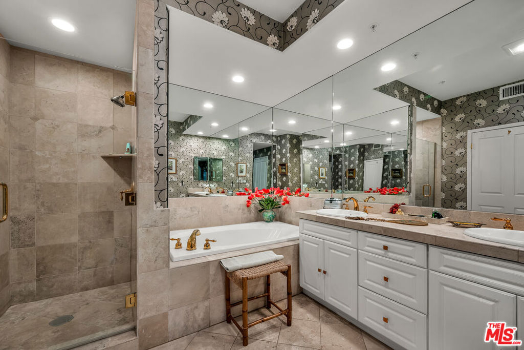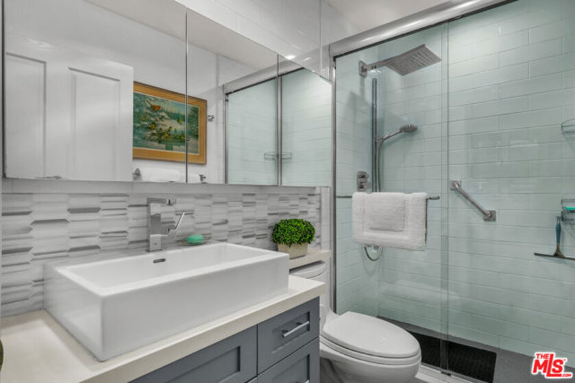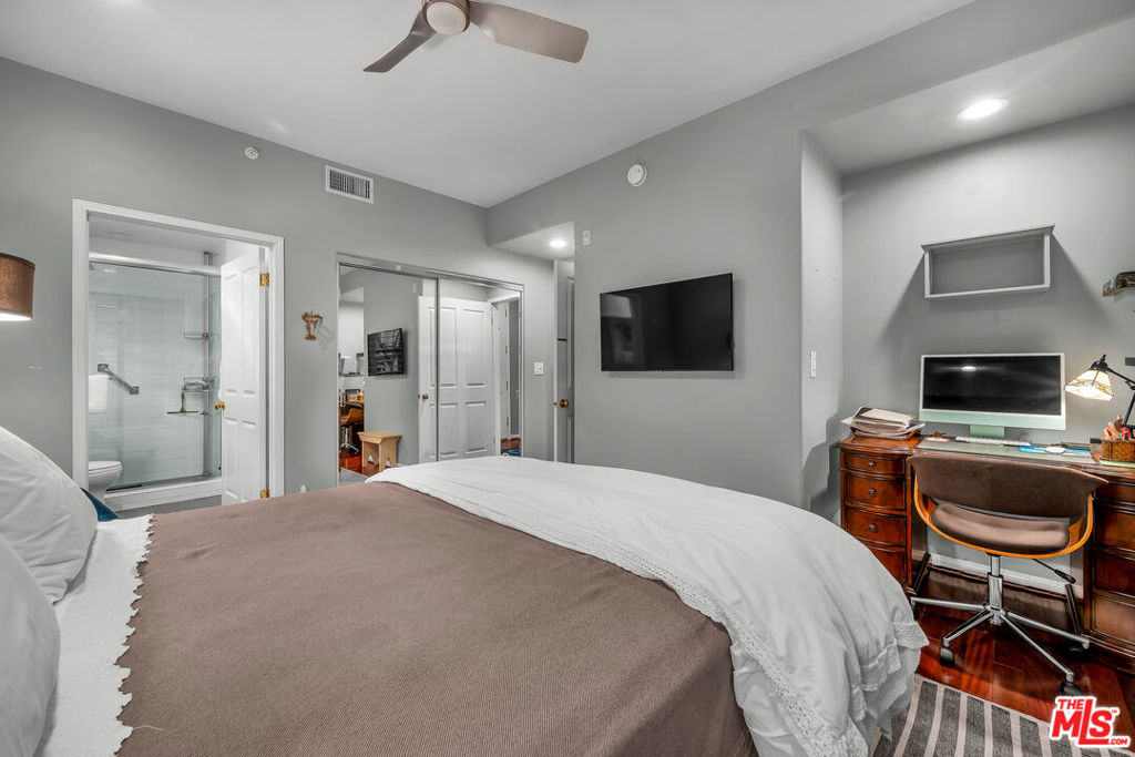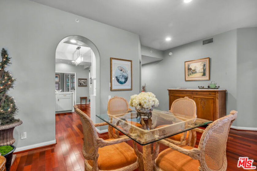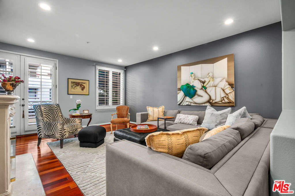 Spacious Brentwood condo that truly feels like home. This beautifully updated residence offers 2 bedrooms 2.5 baths, plus a versatile bonus room ideal for den, office or possible third bedroom. Brazilian cherry hardwood floors, recessed lighting, and plantation shutters run throughout, creating a warm and refined living environment. The redesigned kitchen features a new layout with updated appliances and opens to a formal dining area. The inviting living room includes a newly redesigned fireplace and flows to a private balcony. The oversized primary suite offers dual walk-in closets, a spa-like bath with travertine floors, separate tub and shower, and a custom barn door separating the bedroom and bath. Shade Store motorized shades and remote-controlled ceiling fans add comfort and convenience. Additional upgrades include a top-of-the-line high-power AC and heating system with Nest controls, freshly painted interiors, resurfaced floors, brand new washer and dryer, and updated half bath. All renovations were permitted with the city, including the HVAC system which was inspected and approved. An automatic gas shut-off valve has also been installed for earthquake safety. The second bedroom is generously sized with its own en-suite bath. Additional features include in-unit laundry, two tandem parking spaces with extra storage, and a well-maintained building offering a rooftop pool, fitness room, and ample guest parking. HOA dues also include earthquake insurance for the building and uncommon benefit in many Brentwood properties. Ideally located just moments from Brentwood Village shops, restaurants, and markets.