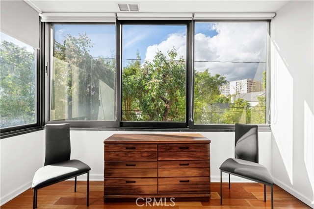 Welcome home to 1,628 SF of quiet living space touting beautiful, large open rooms warmed by hardwood floors and two gas fireplaces. Unit 405 is stunning - A west facing 2 bedroom, 2.5 bath back unit. The living room and fireplace, the wet bar, the dining room, the kitchen and enclosed patio, the oversized windows, all conspire to create an exceptionally inviting space ready for a busy life. Imagine the holidays and celebrations! When it's time to rest, the main bedroom is a lovely, spacious and private retreat with a fireplace, two walk-in closets, a gorgeous remodeled en suite and inspiring views. Neighboring trees and blue sky are outside every window. There's also a large guest bedroom with equally impressive views. Another beautifully remodeled bath is across the hall. A third half bath, off the foyer, has a touch of breathtaking whimsy in its modern jungle design. This delightful home has many practical attributes, too: a gated garage, high ceilings, dual paned windows, central heat and air, plenty of closet space, recessed lighting, in unit W/D, a breakfast nook, stainless steel appliances and granite countertops. Plus, getting groceries from car-to-kitchen is simple when the parking spaces are adjacent to the door entering the building. There's also a gym, pool, spa and sauna. Living in a winning location makes walking fun and commuting a breeze. Spend more time enjoying life and less time driving, with the 405, Westwood Village, UCLA, the Century City Mall, parks, and more, all nearby.