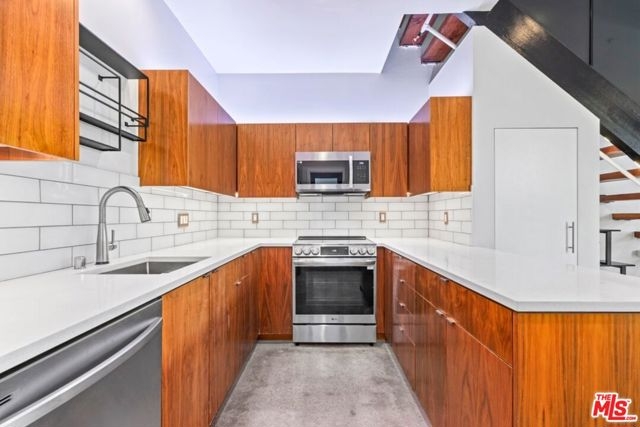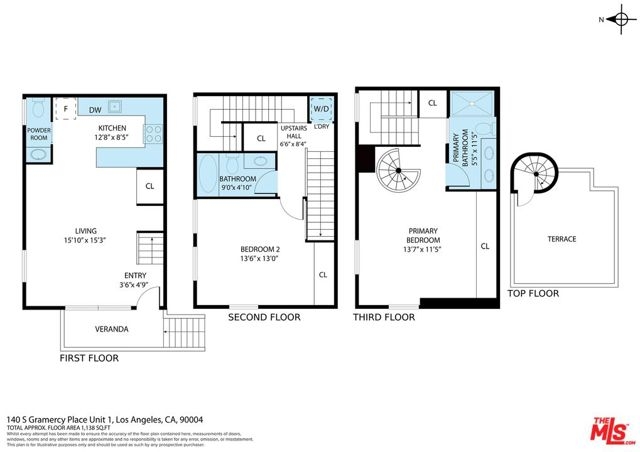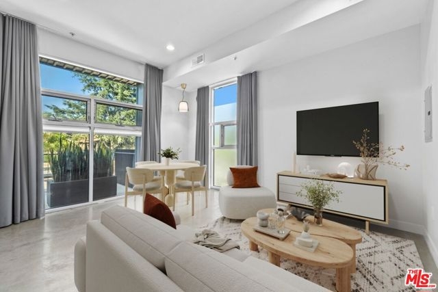 This 1,240 sq.ft. front unit at Gramercy Row in Hancock Park offers privacy, natural light, and thoughtful modern design by AIA-awarded firm Assembledge+. The layout includes an open ground floor with high ceilings, polished concrete floors, smart blinds, smoked glass details, living and dining areas, kitchen with Caesarstone counters and backsplash, LED lighting, updated stainless steel appliances, and a powder room. The second level features bamboo floors, a flexible-use room, full bath, in-unit LG washer/dryer, and storage. The top-floor primary suite includes more bamboo floors, a custom closet, smart blinds, and a skylit bathroom with double sinks, floating vanity, under-cabinet lighting, and a smoked glass divider. A spiral staircase leads to a private rooftop deck with unobstructed 360-degree views from Downtown to the Hollywood Sign. Additional features include a Nest thermostat, Hue smart lighting, Nest smoke detectors, and frosted glass for added privacy. Two tandem parking spaces, guest parking, and elevator access complete the offering. Located near Larchmont Village with easy access to Hollywood and Downtown.