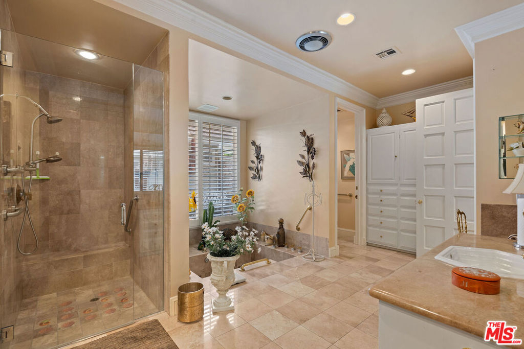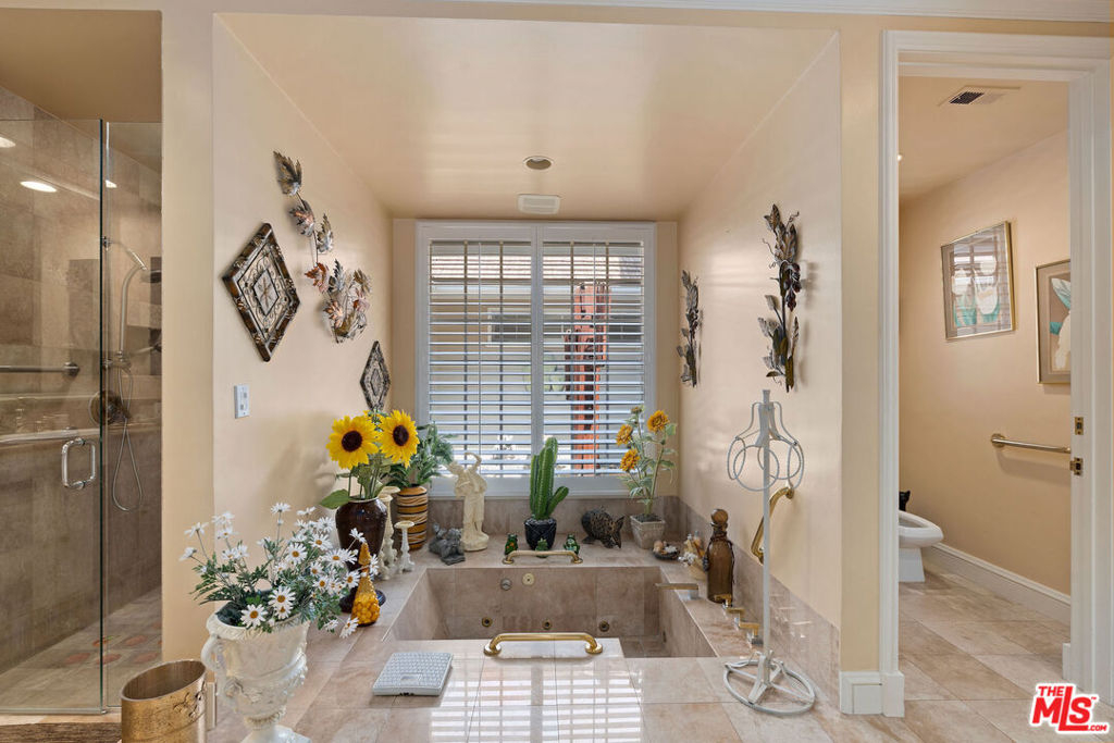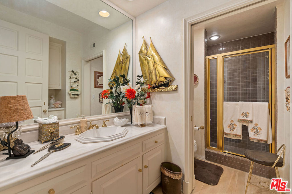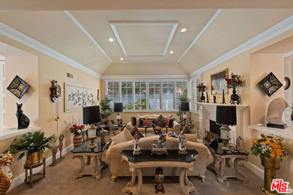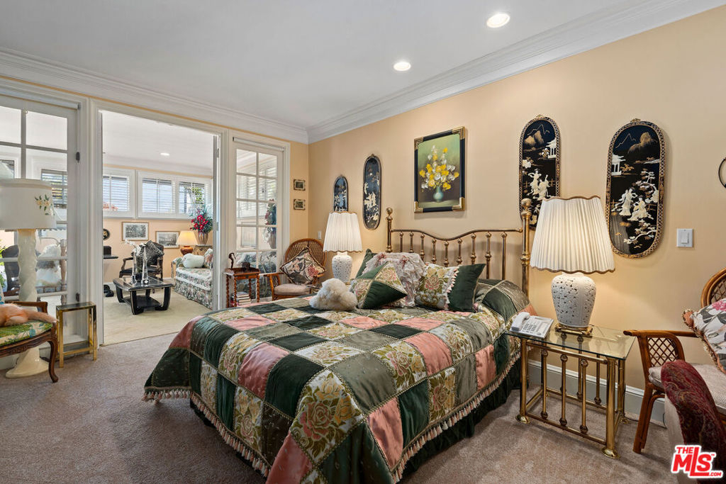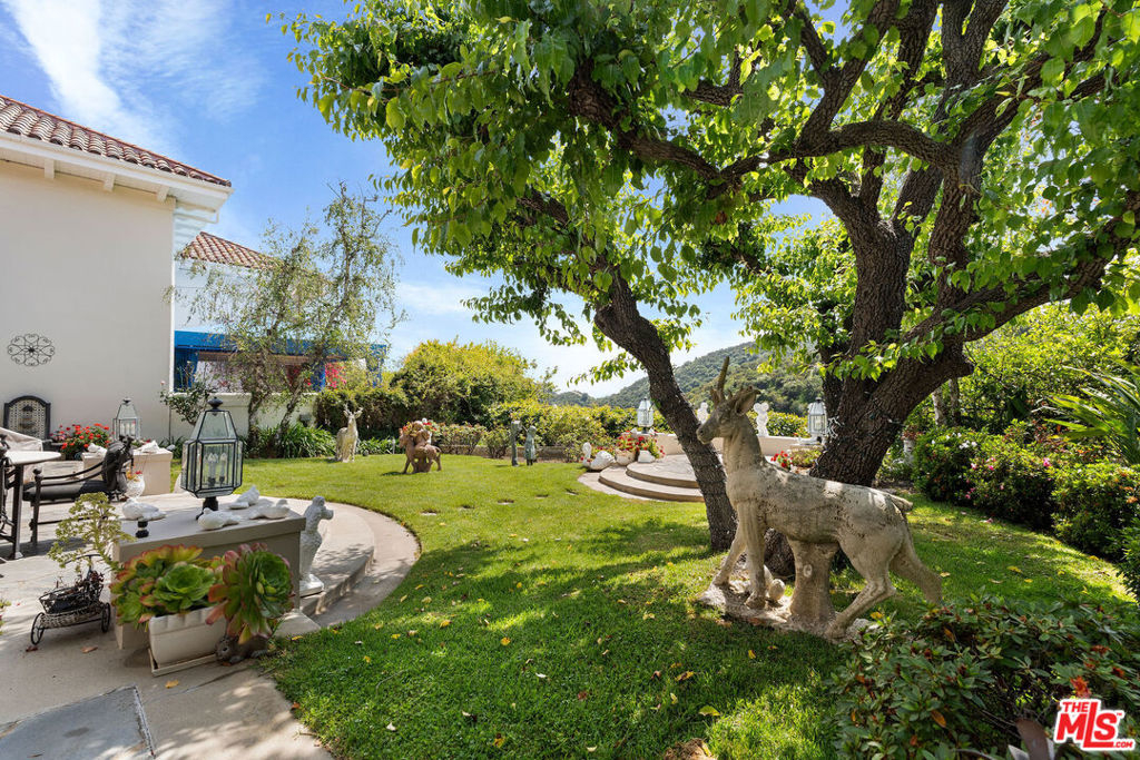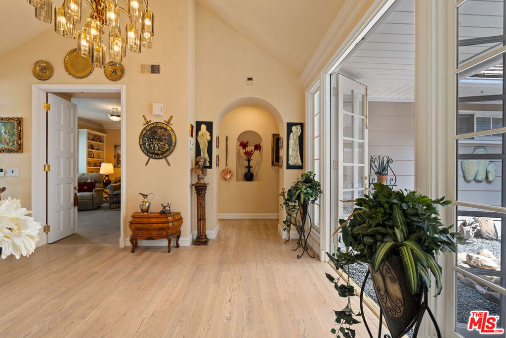 Priced to sell! Fabulous, move in, Located in an enclave of 7 homes at the end with only 1 common exterior wall, Premier Mountaingate rare one-story single family home (only 2 of over 300), gated community with 24/7 security and mountain views. Upon entering this gated home, the foyer has very high ceilings, step down living room & formal dining room w/french doors opening to a private patio & spacious garden with built in barbeque and magnificent canyon views looking westward. A light filled Atrium in the center of the home with a bronze sculpture gives added depth to the entrance.TV friendly book-lined family room with fireplace. Center island bright & sunny kitchen & Breakfast room w/cabinets and french doors leading out to the patio. Special master suite w/fireplace and beautiful sunken marble bath with walk-in shower, bidet and walk-in closet. A guest bedroom, 3/4 bath and sitting room have their own separate entrance from the front. Come and enjoy the Mountaingate lifestyle. Mountaingate. HOA dues include resort-like amenities. Close to all, UCLA,USC, easy 405fwy access & the best of LA. community, 27 hole golf course,pool, spa, tennis courts, pickle ball courts, hiking trails, and 24-hour security patrol. Conveniently located yet seemingly a world away, this idyllic home provides a true sanctuary in one of Brentwood's most desirable neighborhoods. Guest memberships to golf course can be purchased. Excellent restaurant there.