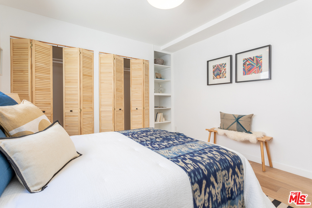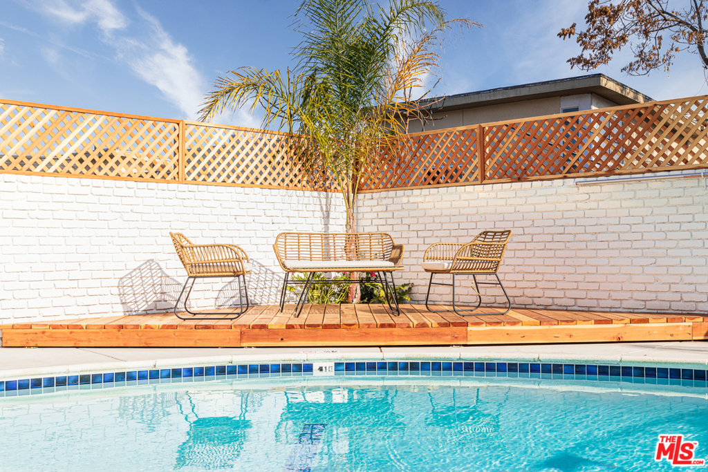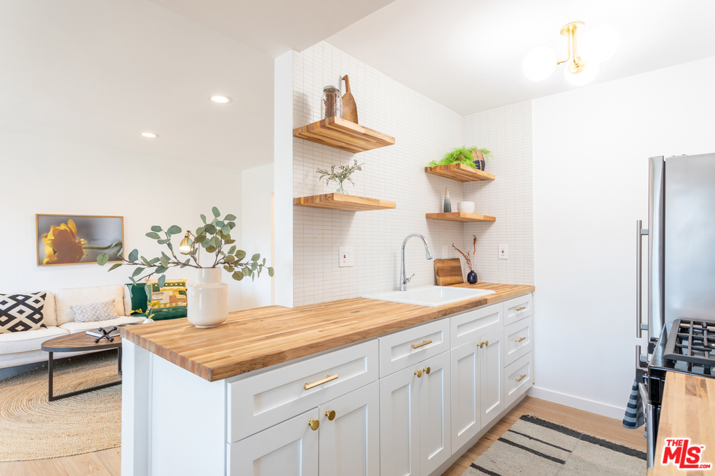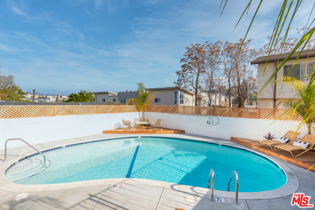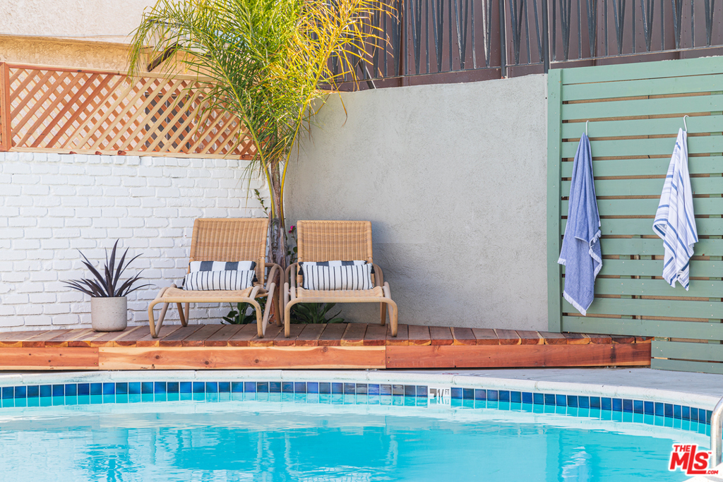 This stunning oversized one-bedroom Mid-Century beauty features white oak flooring throughout, classic design and views of the pool and Echo Park hills beyond. The open kitchen is bright with light and features all-new finishes and appliances, warm butcher block counters, open shelving, brass tones, and crisp white micro tile backsplashes. No details were spared. The large bedroom feels like a suite with double closets and floor to ceiling built-in shelving. The newly designed bath includes a deep tub and pattern tile floors. A hip 12-unit community with a pool, this one is magical with Palm Springs vibes, bordered by white brick, redwood lounge decks and lush landscaping, sitting up on a hill with hillside views and beyond, an urban paradise awaits. AC, in-unit laundry and parking, this jewel has it all. Great Echo Park location, three blocks from Sunset Blvd. restaurants, bars, cafes, shops, and Echo Park Lake. Welcome home.