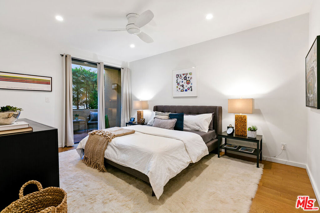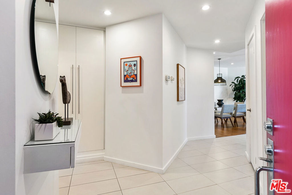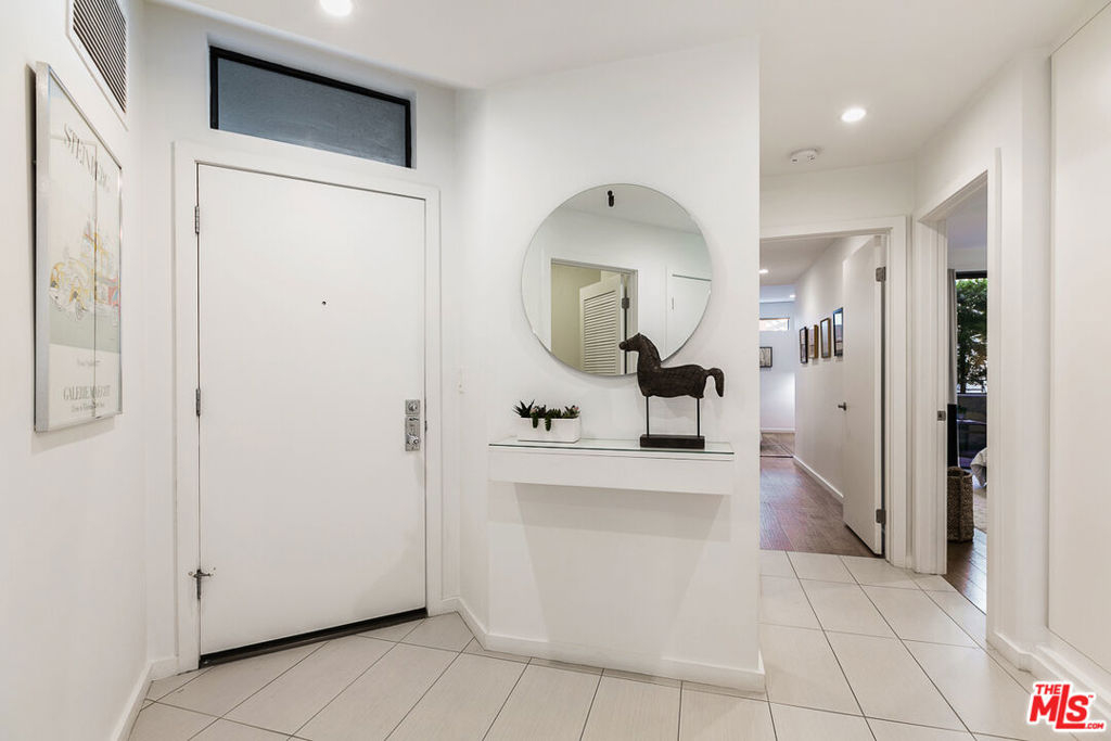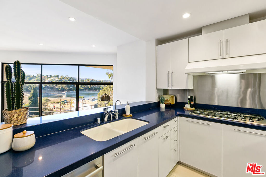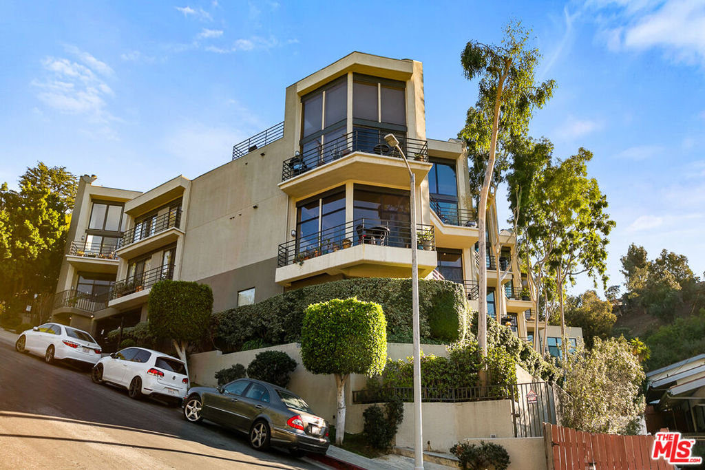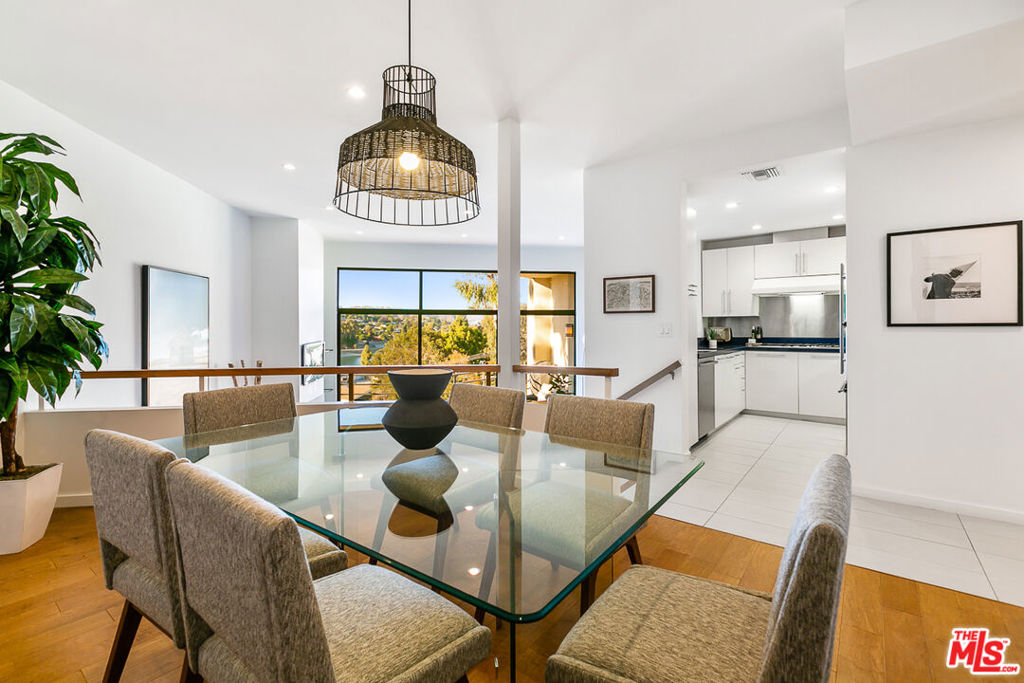 This classy 2BR/2BA condo overlooking the Silver Lake Reservoir offers a rare opportunity to own a piece of local architectural history. Silverview II, designed in the early Eighties by Ko Kiyohara and Walter Abronson, has been described as an example of "classic Modernism." Unit 103, like others in the 12-unit hillside complex, captures stunning views of the Reservoir and mountains beyond, with the private pool and spa area lending a resort feeling to the living experience. The condo has an easy flow. Kitchen, baths, and floor finishes have been beautifully updated in recent times. The open plan features a large, light-filled, step-down living room with hardwood floors and vaulted ceilings. Double-height windows optimize panoramic views and are an invitation to a large balcony beyond. Poised on a mezzanine above the living room, and sharing the awesome vistas, is a formal dining area. The bedroom wing includes a generous primary suite, second bedroom, hall bath, walk-in closets in both bedrooms, and patio access from each bedroom. A spacious laundry room with pantry area is a real bonus. In the parking area below is a storage room (over 100 sf) dedicated to the unit, and secured tandem 2-car parking (with EV hook-up). The dog park at the Reservoir is only a half block away, the Meadows just a short stroll away, and shops, cafes, restaurants, and grocery stores are all very close by.
