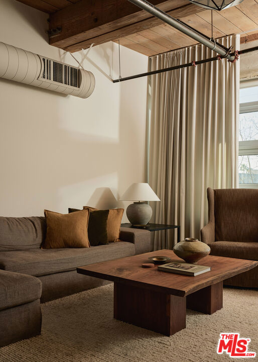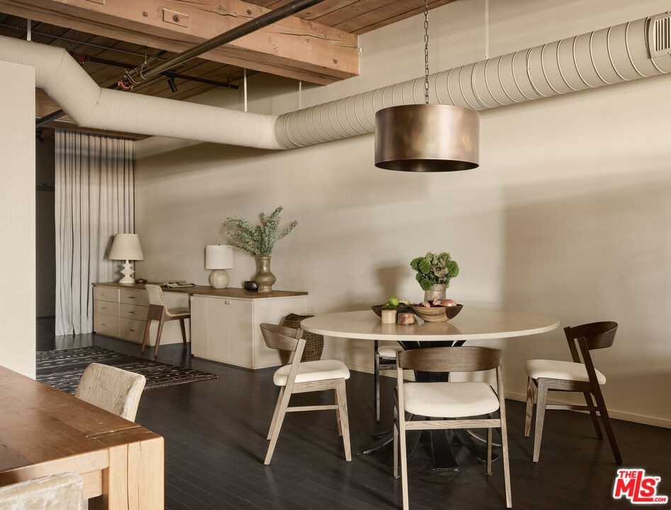 Exceptional Arts District loft in the historic Barker Block, exquisitely designed by noted interior design firm DISC Interiors. A dramatic wall of windows spans the far end of the residence, dressed in floor-to-ceiling drapery that adds warmth and texture, filling the space with an abundance of natural light and framing a coveted downtown skyline view. West-facing units with all wood ceilings and sunset exposures like this rarely come to market at Barker Block, making this residence an exceptional opportunity. This special home strikes a thoughtful balance of warmth and sophistication with hardwood floors throughout, nearly 11-foot ceilings with exposed beams, architectural lighting complemented by designer decorative fixtures, and custom built-in cabinetry providing ample storage at every turn for smart, elevated living. Warm white walls and painted-out ducting give the loft a more cohesive and softened feel. The heart of the loft is a chef's kitchen outfitted with top-of-the-line, recently updated appliances seamlessly anchoring the open layout, ideal for both everyday life and entertaining. A spacious full bath includes in-unit laundry, while the generously sized bedroom features luxurious custom curtains that provide privacy and a thoughtful separation of space. The bedroom is complemented by a large wall of custom designed closets with antique brass hardware, and a built-in wall-to-wall oak dresser. A custom built-in 16' desk with a full wall of bookshelves thoughtfully separates the entry and dining areas, adding both function and architectural interest.The Barker Block is a full-service building offering 24/7 front desk and security, complimentary common-area WiFi, an outdoor lounge with fire pits, and a resort-style rooftop with heated pool, spa, BBQ areas, and a fitness center showcasing some of the best panoramic views in downtown Los Angeles. Known for its striking architectural details and timeless industrial character, the live/work designated Barker Block also offers a dynamic and sophisticated creative community spirit.Located in the heart of the Arts District, moments from Bavel, Girl and the Goat, Verve Coffee, Blue Bottle Coffee, as well as walking distance to Still Life Ceramic Studios, Dover Street Market, Bestia, Soho Warehouse, and art galleries such as Hauser & Wirth, this exceptional loft delivers a rare blend of architectural pedigree, thoughtful design, and a vibrant, walkable urban lifestyle.