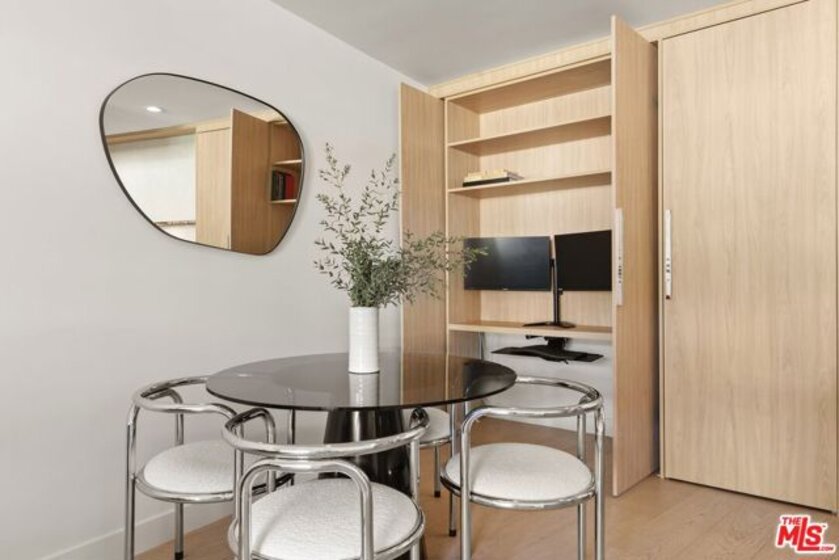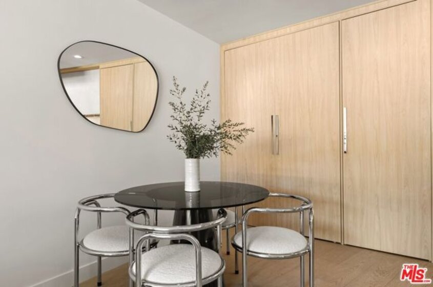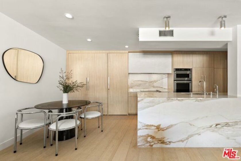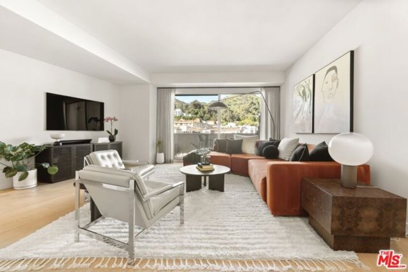 Sleek, modern condo with Hollywood Hills views in a full-service doorman building, moments away from Runyon Canyon. The unit features an open floorplan layout with wide plank hardwood floors, updated kitchen and 1.5 bathrooms, in-unit laundry and a private balcony. Franklin Towers residents enjoy amenities that include a pool, hot tub, sauna, gym and valet guest parking.The recent renovation was completed in 2024 with a thoughtfully designed kitchen with grain-matched cabinetry, porcelain slab waterfall counters, Roman clay ventilation hood and integrated Fisher & Paykel refrigerator. A built-in, low-profile workstation offers a convenient work-from-home solution, blending into the residence's clean lines. The bedroom is appointed with two generous closets and a remodeled full bathroom with separate bathtub and glass-enclosed shower. Additional storage includes a hall closet and built-in cabinetry. An HVAC system installed in 2025 and a Nest thermostat ensure comfort year-round. Dedicated parking space with electric vehicle charging.