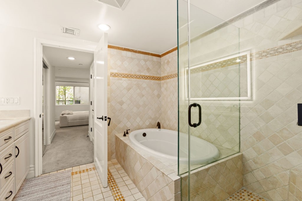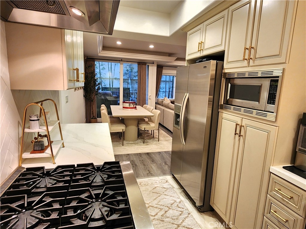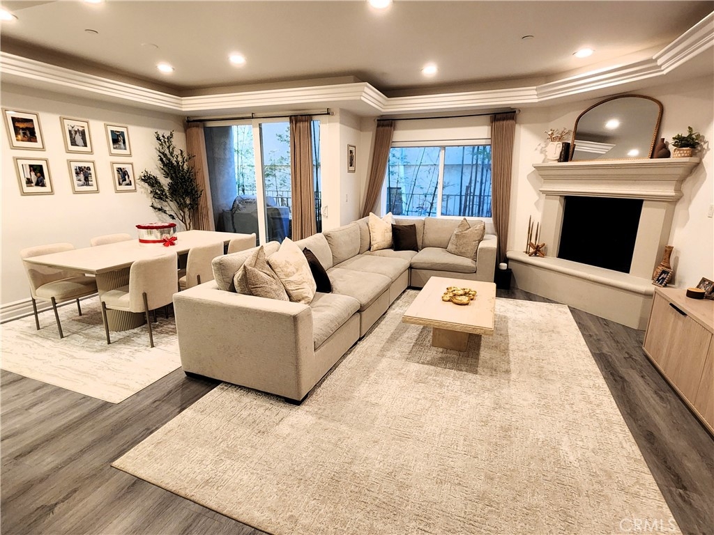 Experience refined living in this beautifully remodeled two bedroom, two-and-a-half bath "townhome style" residence, perfectly blending contemporary design with timeless sophistication. Thoughtfully designed, both bedrooms are located on the upper level, each featuring its own elegantly appointed en-suite bath, while a chic powder room on the main floor offers convenience for your guests. The remodeled gourmet kitchen showcases high-end Viking appliances, custom cabinetry + ample "Calacatta Style" quartz counter-tops with a waterfall edge. The kitchen flows seamlessly into the dining and living areas. The open-concept design is enhanced by custom crown molding, refined finishes, and a cozy gas-burning fireplace that anchors the living space with warmth and style. Additional amenities: central air conditioning; luxury vinyl flooring; stylish porcelain flooring in kitchen and powder room; stackable washer/dryer closet on 2nd floor; voice command lighting and window coverings; private balcony; exceptional closet space (2 walk-ins in primary bedroom) + additional mirrored wardrobe; spacious walk-in in guest bedroom; dual vanity in primary bedroom + soaker tub & separate shower; 2 secured/assigned tandem covered parking spaces & the list goes on... Centrally located near La Cienega’s famed Restaurant Row, The Beverly Center, The Grove, and more — this exceptional home combines modern living with unbeatable convenience.