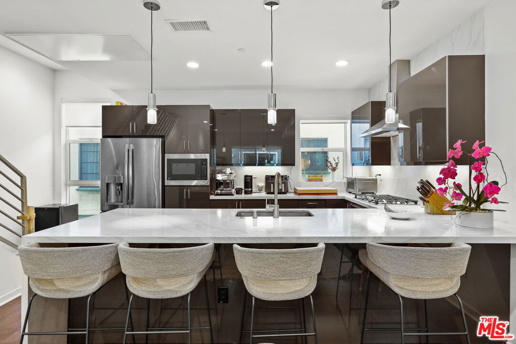 Welcome to 8408 Blackburn Ave a beautifully crafted 3-bedroom, 3.5-bathroom modern home built in 2019, nestled in one of LA's most coveted neighborhoods just south of 3rd Street in Beverly Grove. Part of the 10 Blackburn small lot subdivision, enter on the ground floor to find a private guest bedroom with its own en-suite bath featuring a walk-in shower, then head upstairs to the bright and open main living level where an elegant dining room, spacious family room, and a generous kitchen with GE Profile appliances and ample cabinetry come together seamlessly with a balcony off the dining area and a powder room completing the floor. The third floor is home to two additional bedrooms, including a serene primary suite with a walk-in closet, double vanity, walk-in shower, and private balcony, while the secondary bedroom offers its own en-suite tub/shower bath, and a stacked washer/dryer and built-in storage closet add everyday convenience. All bathrooms are appointed with dimmable LED-lit vanity mirrors, custom window treatments are found throughout, and three motorized shades on the soaring high-ceiling transoms add a seamless finishing touch. Above it all, a professionally turfed rooftop deck with a wind-sensor retractable awning and stunning views of the Hollywood Sign offers the ultimate LA outdoor living experience. The attached 2-car garage features epoxy floors and an EV charging station, and the unbeatable location puts you steps from Joan's on Third, Oste, Izakaya, Bacio Di Latte, and the best of 3rd Street dining and shopping, a 5-minute walk to the Beverly Center, and a 10-minute walk to The Grove and the soon to be brand new, largest Whole Foods on the West Coast a rare turnkey modern home that truly has it all.