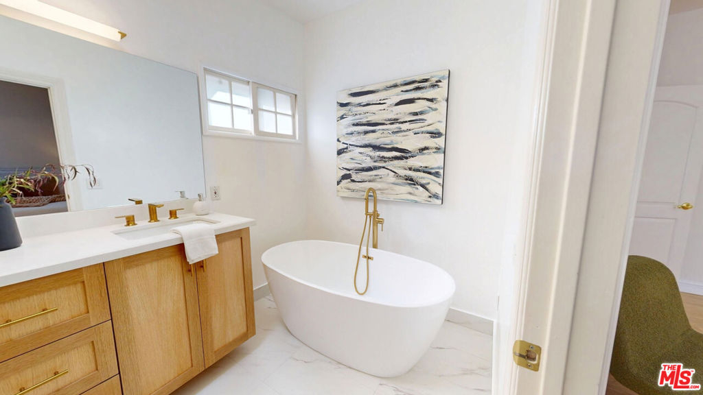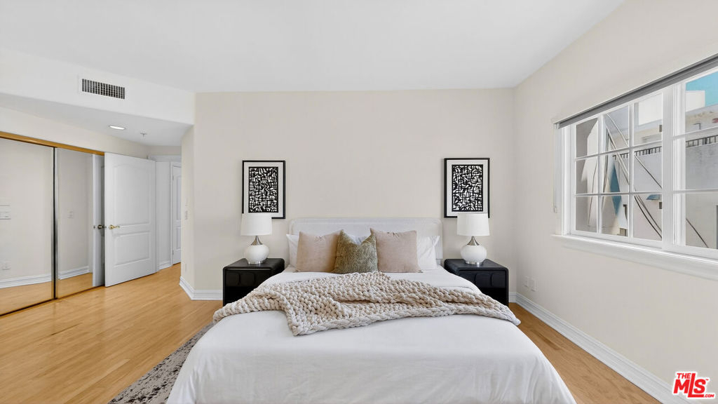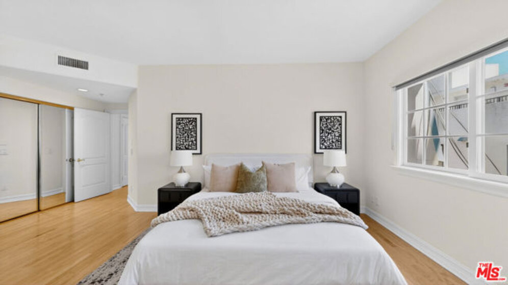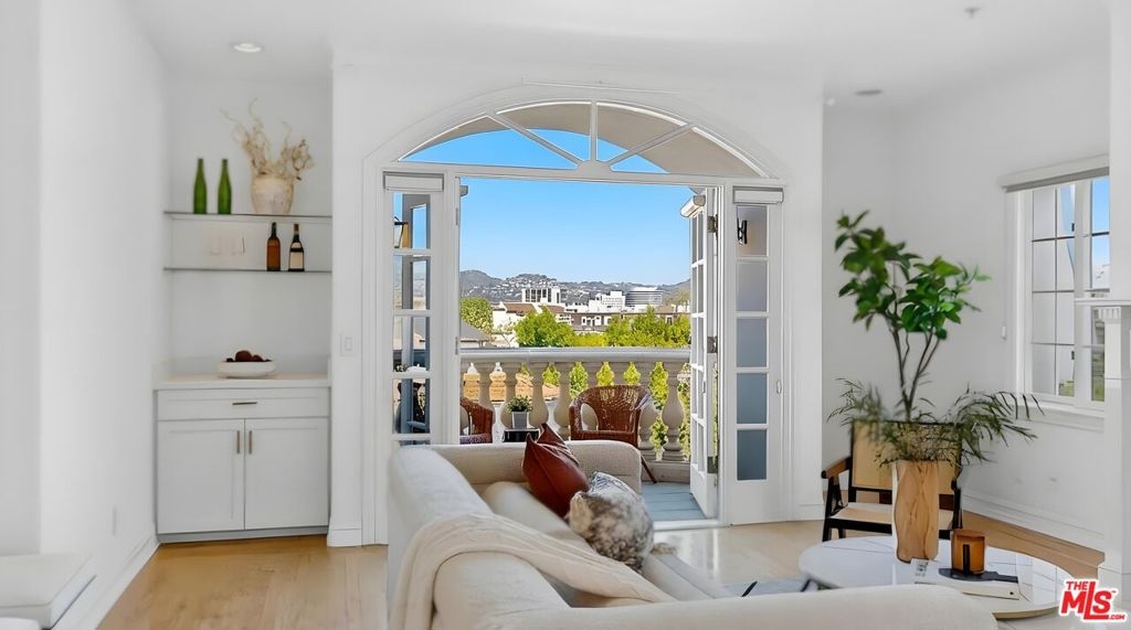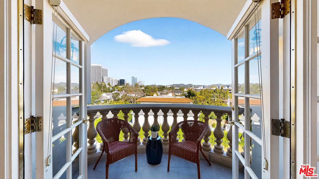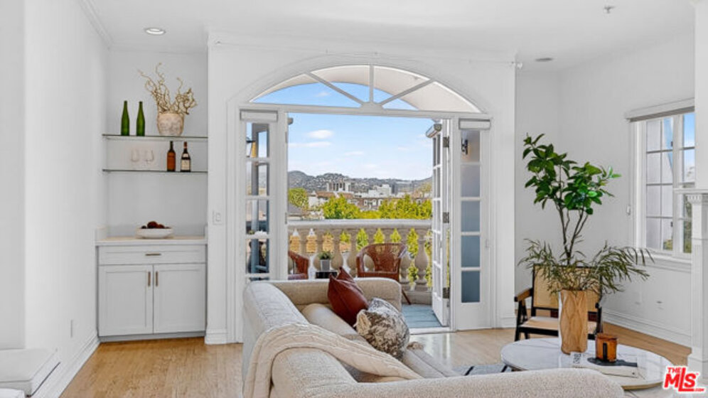 Perched atop a quiet, tree-lined street in prime Beverlywood, just moments from Beverly Hills, this top-floor penthouse has been newly renovated with a sophisticated design. The 2-bedroom, 2.5-bath residence blends timeless elegance with modern luxury. Bathed in natural light, the interiors are framed by oversized windows that create a luminous, gallery-like ambiance throughout. The formal living room is both dramatic and inviting, anchored by a statement fireplace and highlighted by arched French doors that open to a private balcony. From here, sweeping mountain vistas and shimmering Beverly Hills city lights provide a breathtaking backdrop for sunset evenings. The kitchen has been impeccably renovated with top-tier, brand-new appliances and curated finishes. A deep-basin farmhouse sink, bespoke cabinetry, and an intimate breakfast nook evoke effortless European charm while delivering modern functionality. The primary suite is a serene retreat, offering a generous walk-in closet plus an additional reach-in closet. The spa-caliber primary bath features a double vanity, freestanding soaking tub, and a separate glass-enclosed shower, creating a true sanctuary experience. The secondary bedroom is also en suite, and a chic powder room serves guests with understated elegance. A spacious in-unit laundry room, two secured parking spaces, and private storage complete the offering. Ideally located adjacent to Beverly Hills, Century City, and Hillcrest Country Club, and moments from world-class shopping, dining, parks, and places of worship, this penthouse represents a rare opportunity to own a turnkey, light-filled retreat in one of the Westside's most sought-after neighborhoods. Please note that certain images have been virtually staged for illustrative purpose.